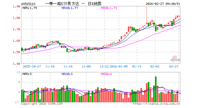 2月27日,一带一路ETF易方达(515110)开盘跌0.44%,报1.808元。一带一路ETF易方达(515110)重仓股方面,小商品城开盘跌0.20%,金风科技跌1.34%,中国铝业跌0.82%,烽火通信跌2.80%,东阿阿胶涨0.02%,南网能源涨0.13%,广东宏大跌0.26%,云铝股份跌0.90%,建设银行涨0.00%,中国联通跌0.20%。