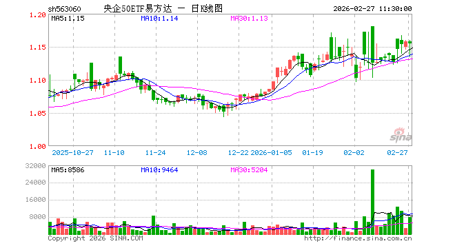 2月27日,截止午间收盘,央企50ETF易方达(563060)跌0.26%,报1.155元,成交额90.72万元。央企50ETF易方达(563060)重仓股方面,长江电力截止午盘涨0.15%,中国船舶跌1.18%,中国神华涨0.29%,中国石油跌0.46%,海康威视跌0.70%,中国建筑涨0.20%,中国电信涨1.06%,中国铝业涨0.52%,中远海控跌0.73%,中国中免涨0.59%。