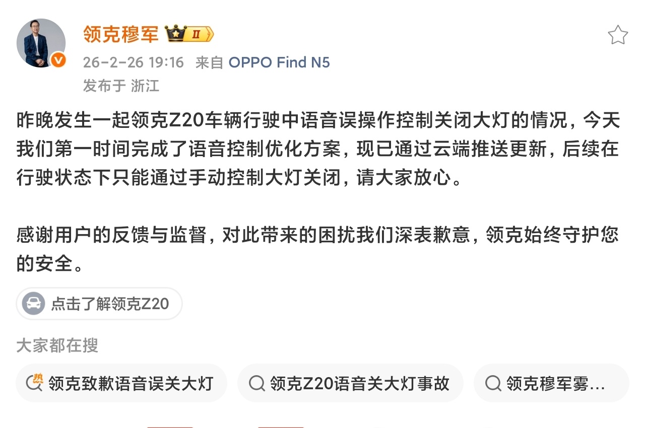 最后,这样的设定本来就非常不合乎逻辑,关键的安全功能需要实体按键,而且不应该语音能控制。领克致歉语音误关大灯 男子夜间开车被语音助手误关大灯 多位领克车主测试语音关闭大灯