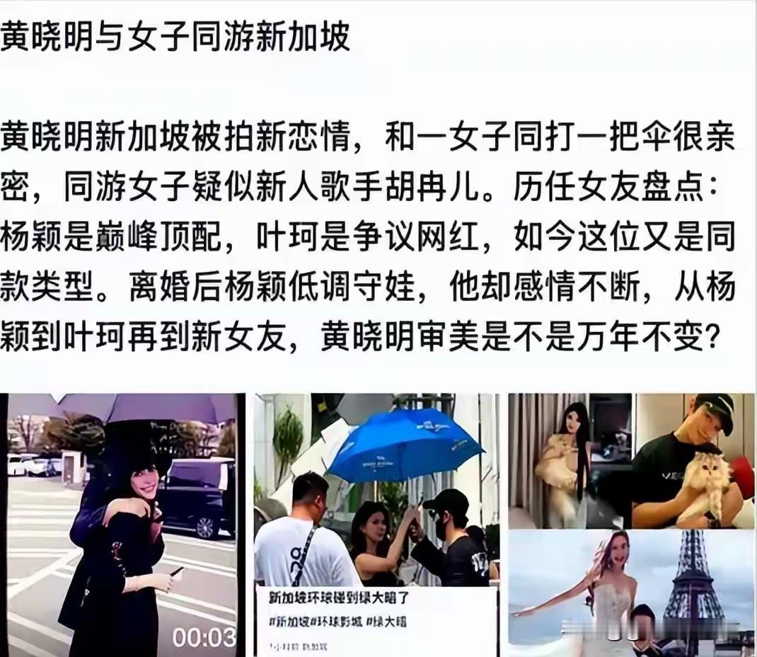 黄晓明在新加坡被网友偶遇,与神秘女子互相撑伞,举止亲密,疑似是新恋情被曝光了。 网友们立刻扒出了这位女子的身份,系新人歌手胡冉儿,背景学历都可以。 但和绿大暗谈恋爱免不了被拿出来和前妻杨颖和前女友叶珂做比较。 说实话,这次绿大暗的审美也是严重降级了,美貌不如杨颖,甚至面相看起来不如叶珂舒服。 网友们对黄晓明的评价也是既犀利,又中肯!黄晓明