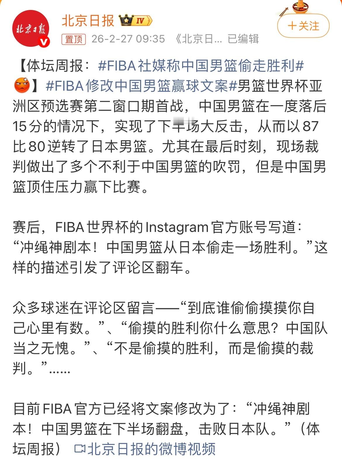 FIBA社媒称中国男篮偷走胜利FIBA修改中国男篮赢球文案