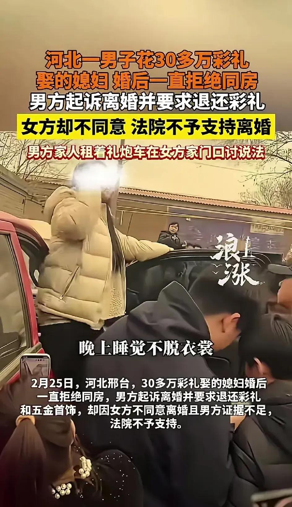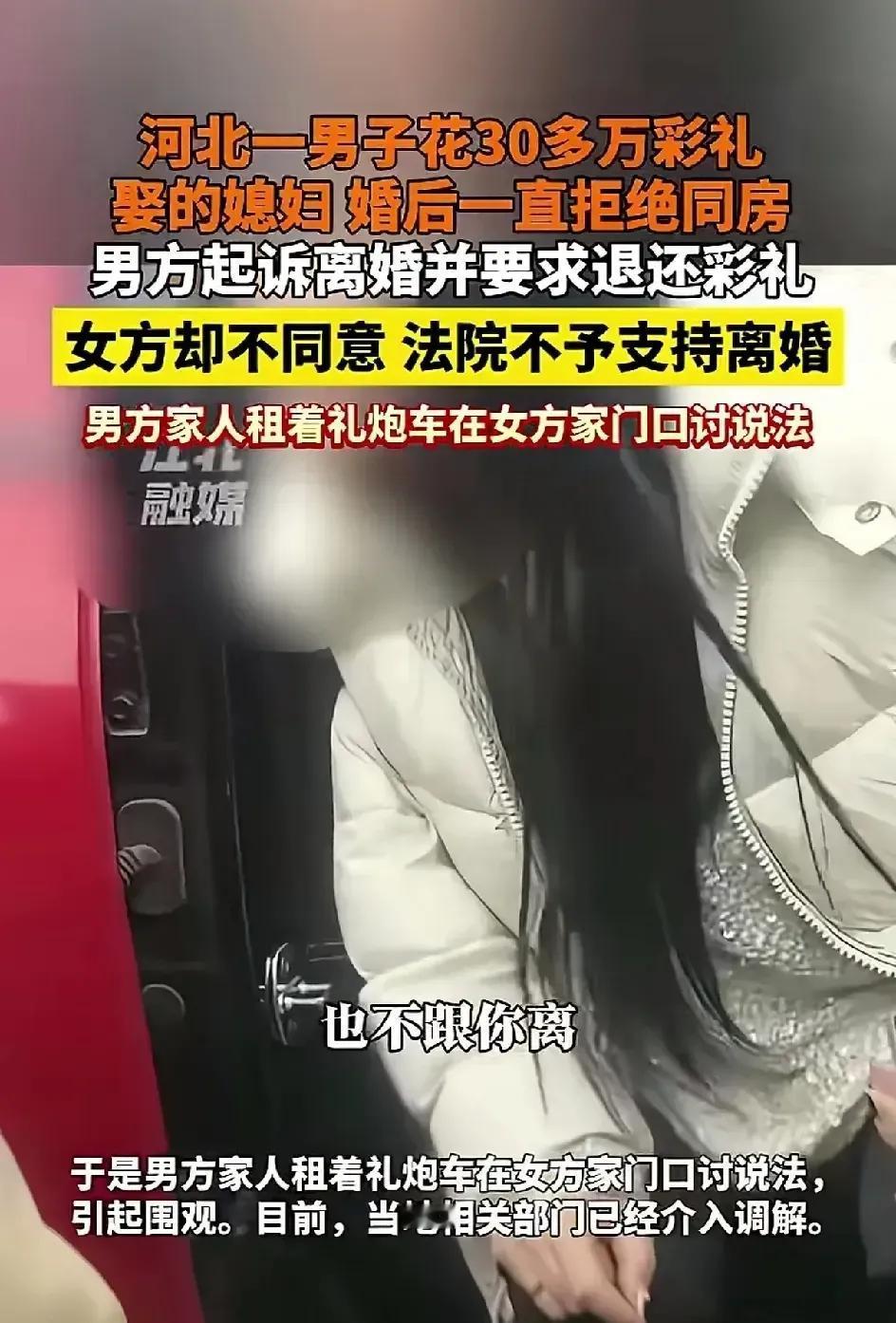 河北一男子花了30多万彩礼,娶了一个妻子,结婚10个月,女方睡觉不脱衣服,不愿意同房,也不离婚。男子起诉离婚要求退彩礼,女方不同意,法院也不支持离婚。男方的家人没办法 租着礼炮车在女方家门口讨说法。 这就奇了怪了。既然不愿意嫁给他,为什在他家待了10个月,还收了30多万彩礼? 因为女方不愿意离婚,所以法院不支持离婚。女方的目的是什么?拖着男方也拖着自己。既然不喜欢他,为什么要嫁给他呢?结婚10个月不同房,真的是有悖伦理。