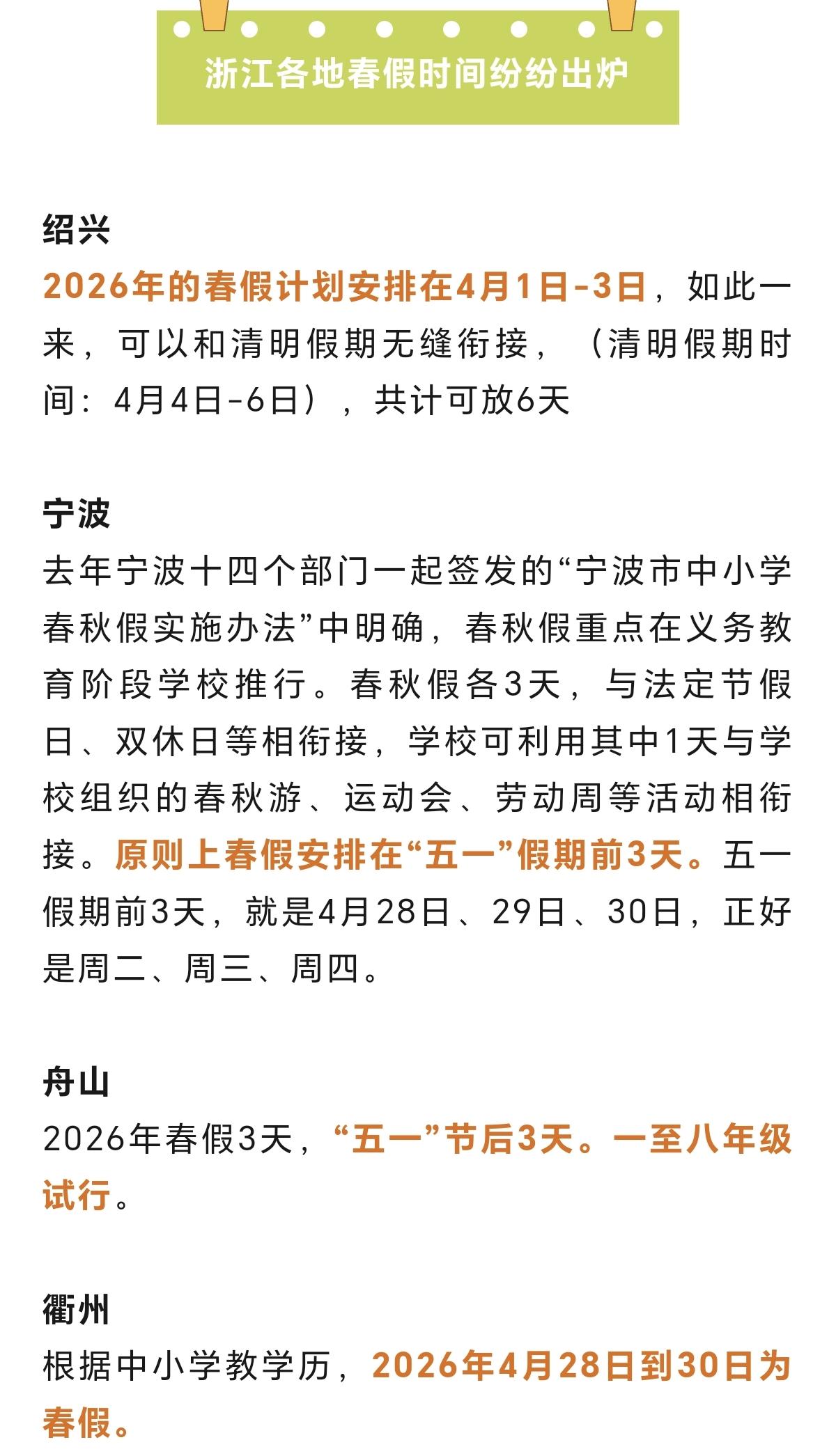 浙江各城市中小学生,春假放假时间,陆续发布了。有的地区,春假+五一假期+调休,可以连休10天。有的城市是在清明假期之前,放三天,加上清明假期,共可以休息6天。 也有的城市4月28日-30日放春假,加上五一假期(五天),共可以放8天。另外还有城市,是在五一假期结束后,连着放3天春假,也是组合成8天。 这样一来,今年浙江省各城市中小学生的春假,也是错峰放假。这样其实,也挺合理的。到时候,可以给接待学生的热门景区,一些准备时间。也不至于各个城市的家长和学生,都拥挤在一起,去旅游。