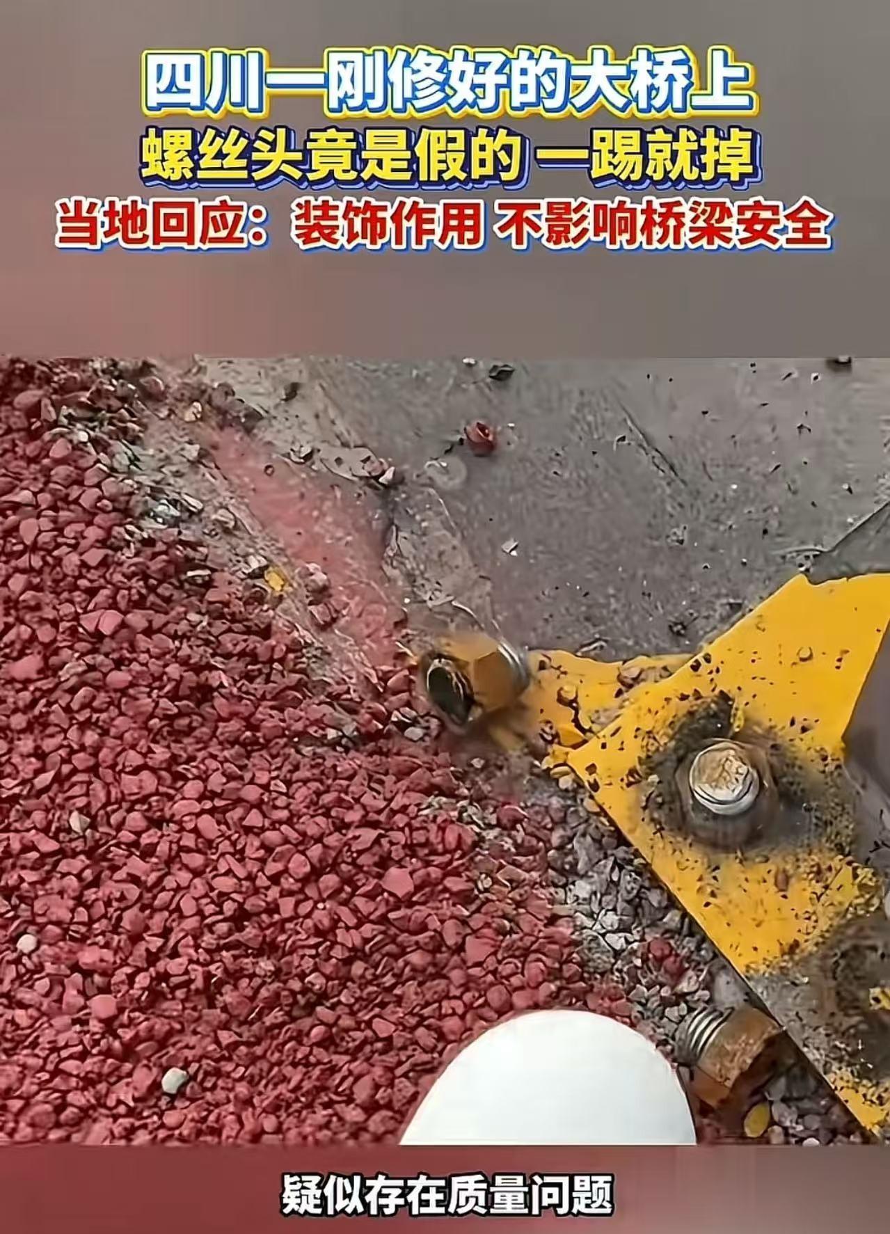 螺丝一踢就掉, 桥真安全吗? 谁来信得过。 南部县肖家大桥刚修完没多久,村民一脚就把护栏上的“螺丝头”踢掉了。 视频传开后,大家心里都咯噔一下。 官方后来解释说那是装饰用的,不是真受力的零件,桥本身没事。 可问题不在桥倒不倒,而在人信不信。 你站桥上,看到的全是螺丝样子,结果一碰就掉,谁能不怀疑别的地方? 专家说焊得牢,可焊缝有没有检测报告?谁看过了?这些都没人拿出来。 图纸、检测数据、验收过程,全部公开。 老百姓不懂焊接应力,但知道东西掉得容易,心就悬得高。 解释不能光靠嘴,得把实打实的证据摆出来,不然说一百遍“安全”,也没人听。 修桥是为让人放心走,不是为了让人盯住螺丝看。 那天视频里,那颗掉下来的假螺丝,还在地上滚着。