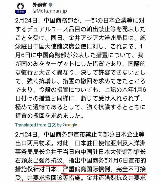 日本那边,不装了。一份声明直接发到我们脸上,措辞极重:“绝对无法接受!”就因为我们把那20家日本实体,放进了管制名单。电话打到我们使馆,公使直接被叫过去当面交涉。对方几乎是敲着桌子质问,说这事只针对日本,不符合国际规矩,要求我们立刻、马上、无条件撤销。 倭寇掐我们光刻机和高端机床脖子不就是违反WTO的自由贸易规规!寇往吾亦往! 所以说啊,他们霸权双标主义玩的太久太溜了,让南墙给他们撞撞,让铁板给他们踢踢,就习惯就好了! 日本连原子弹都能接受,核废水都能喝,没什么不能接受的,受着就行了。 为什么只针对日本?这问题太好回答了,因为国家安全受到了威胁。弱国无外交,曾经的战败国有什么资格叫嚣,卡就对了,打蛇打七寸,痛打落水狗。 战败国不允许有军队,不允许有攻击性武器。你们小日本遵守了吗? 对任何可能暗中转移稀土使用,任何难以核实的企业都禁止。接不接受是你的事,管不管制是我的事,你要接受不了就慢慢适应,适应一段时间你就能接受了! 既然触碰了我们的底线,我们再怎么做也不过分。管你喜欢不喜欢管你接受不接受你都得受。🐶🐶🐶 坚定支持中国政府的决定,对小日本鬼子绝对不能软弱,小日本对中国两次侵略,给我们中国造成巨大的伤害,始终不道歉,从不反省侵略暴行。非常非常可恶。 前几代人为我们吃饱穿暖浴血奋斗,现在轮到我们为子孙后代涤荡宇内了。 那年,疫情,作为日本是亚洲发达的国家,又是近邻,本应本着睦邻友好的原则为我们提供帮助,可是日本却配合美西方对中国无端指责,并提出天价所谓“赔偿金”,这种落井下石的恶劣行径,中国人是记忆犹新的,所以现在我们反制,没毛病。 网友表示:很明显是借鉴从明朝清朝民国新中国与小日本打交道的经验,从军事对抗到经济对抗,我们重新选择了与小日本过招的方式,鉴于背后的老美撑腰,,毫无疑问打仗是最不明智的,经济制裁虽然我们也受损,但总比打仗损失要小,打蛇打七寸,要打就要把它打疼了。