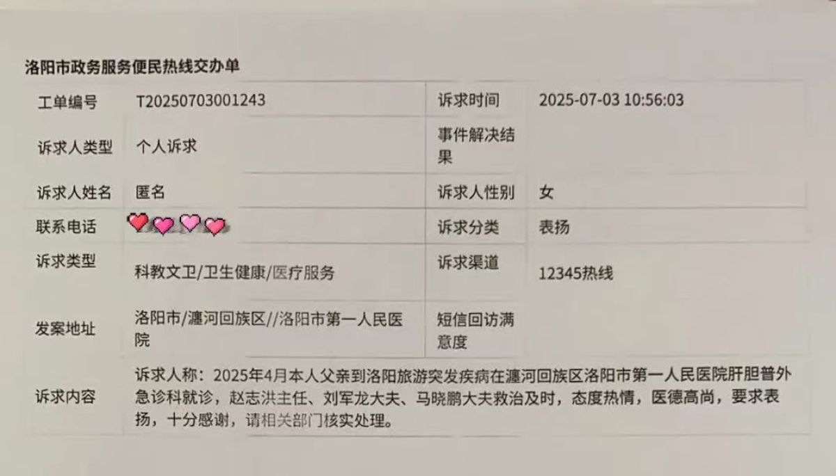 2025年五一假期,辽宁盘锦游客范女士一家在白马寺游玩时,73岁老人突发身体不适、意识模糊,紧急送医后,医院迅速安排救治。因跨省就医未携带身份证,家属对住院手续一筹莫展,护士全程耐心指导办理;主治医生持续安抚情绪、细致讲解病情与治疗方案,老人次日便能下床活动。康复返乡后,范女士特意通过洛阳市12345政务服务便民热线留言致谢。
