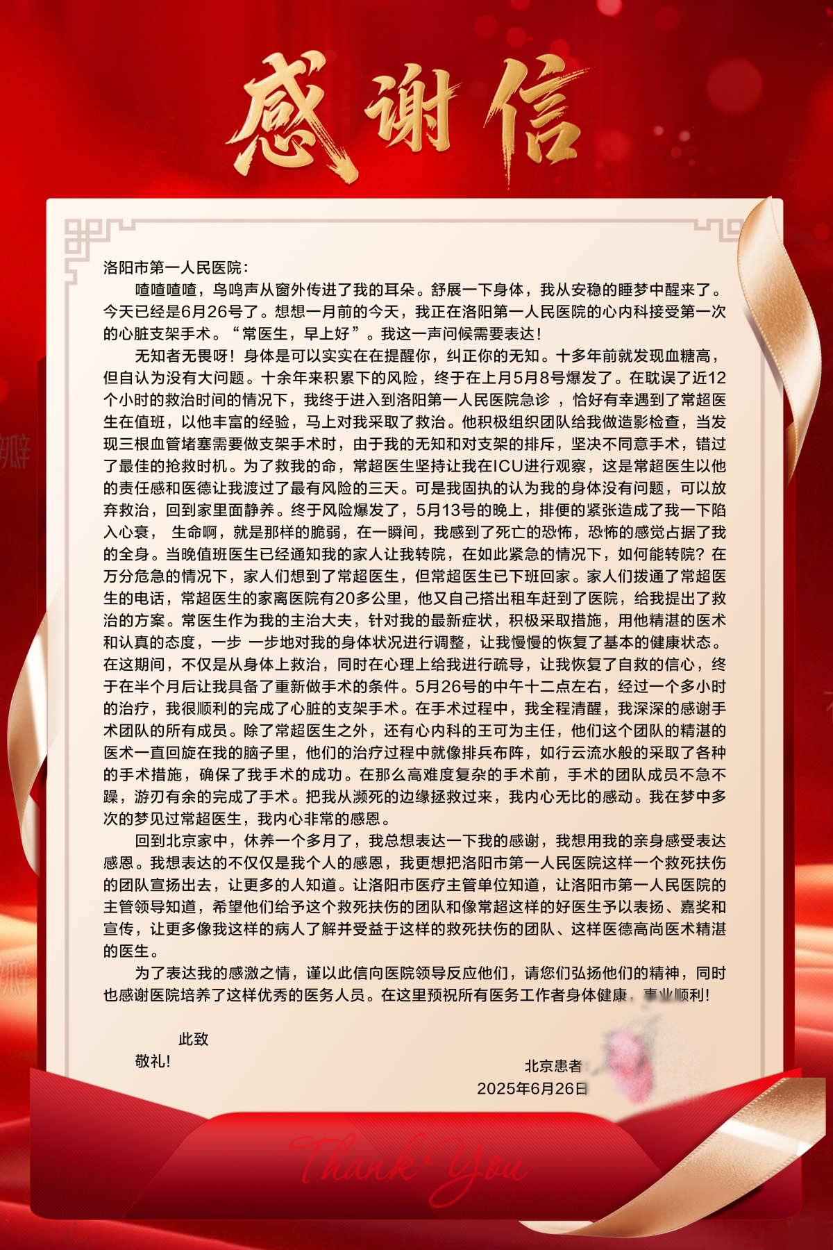 2025年5月底,来自北京的王先生突发急性心梗,被紧急送往医院救治。起初他对病情存疑,坚持出院,医生多次耐心劝说,建议留院观察。不料住院期间突发危险状况,主治医生连夜从家中赶回,与团队全力抢救,将其从生死线上拉回。康复回京后,王先生专程写来感谢信:“感谢洛阳的医生,把我从死亡边缘救回。”