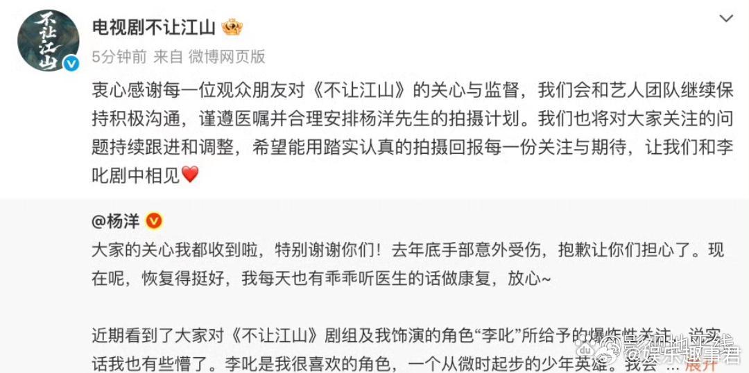 杨洋发文回应不让江山争议27日,杨洋《不让江山》新路透曝光,杨洋的手好肿引发热议。杨洋发文报平安感谢大家关心,并表示恢复得挺好。对于《不让江山》相关争议,他表示李叱是自己很喜欢的角色,会和他一起成长、努力,也拜托大家多多爱护他,“网上的消息很多,请大家都多一点点耐心,不信谣、不传谣,友好地交流。”