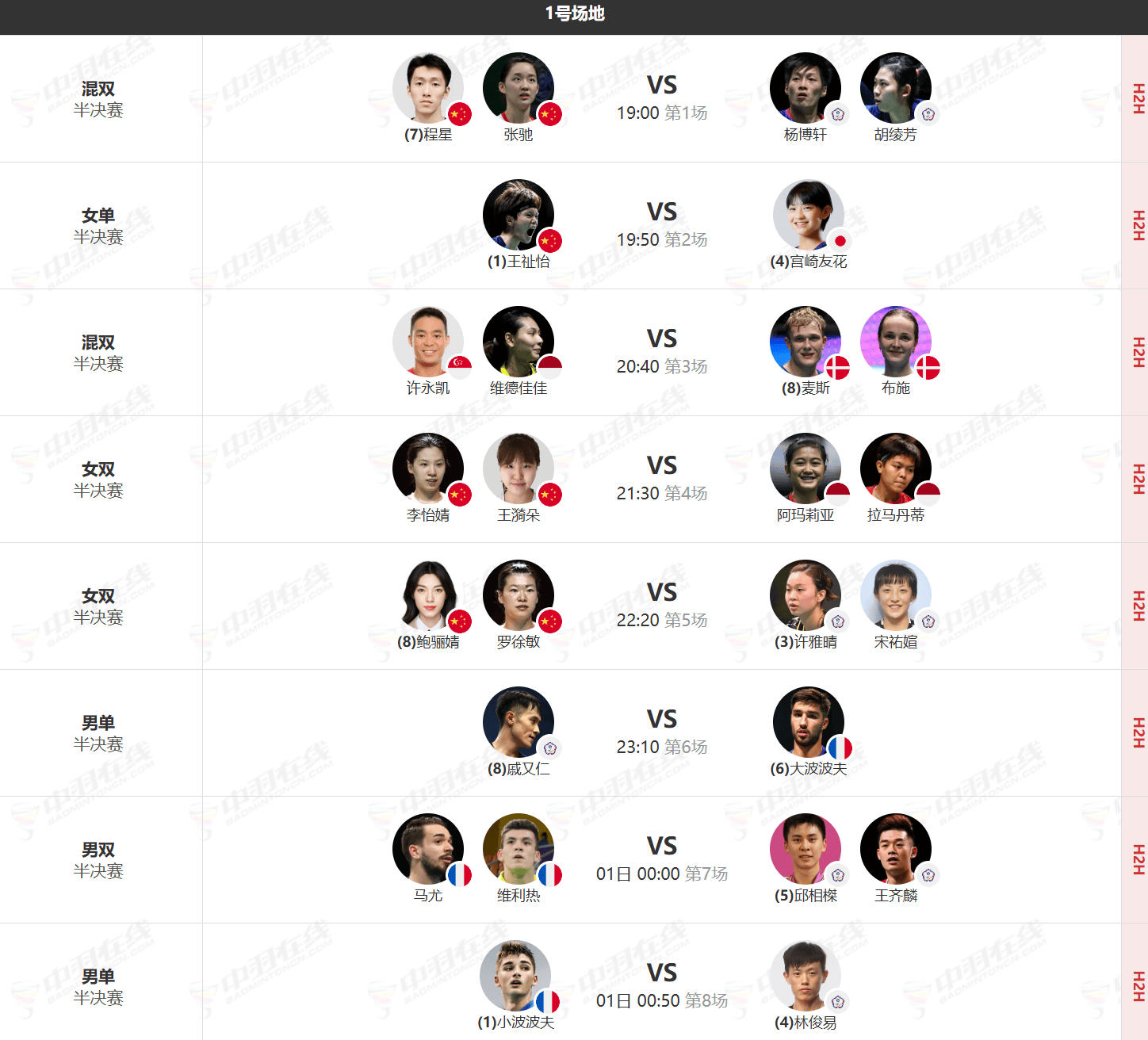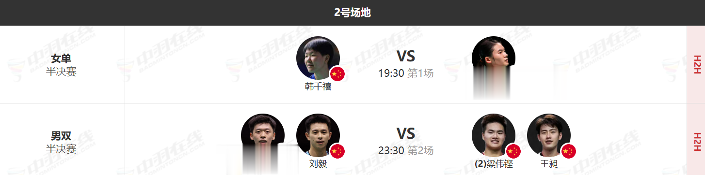 虎扑02月28日讯2026年德国羽毛球公开赛今天将进行倒数第二个比赛日的争夺。四强对决中,韩千禧与韩悦、梁伟铿/王昶与陈柏阳/刘毅将上演国羽内战,角逐出一个决赛名额;两对国羽女双则是各自面对半区的最后一个对手,力争会师决赛;王祉怡、程星/张驰也同样将会出场迎战各自对手,向决赛席位发起冲击。