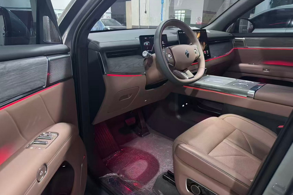 从图片看来,这款新车基本上延续了当前新势力打造大六座SUV的一贯思路,大沙发、大彩电、大冰箱等基本都配齐了。内饰是典型的鸿蒙智行风格,T型中控台非常简约,仅提供悬浮式仪表盘和大尺寸中控屏,由于方向盘前方并没有凹槽,预计并不会配备HUD抬头显示,方向盘为三辐式平底方向盘,左右两侧为类似问界M9等界系列车型的滚轮设计,中间则是宝骏的Logo。在两个座椅之间的中岛区域,可以看见两个手机凹槽,大概率会支持无线充电,往后看还有理想L系同款的双杯架,下方则进行掏空处理,储物空间不小,还有两个带荧光灯的充电接口。