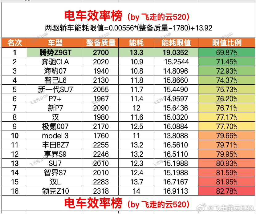 勇夺电车效率榜 第一名,比之前的奔驰CLA进步了不少呢,成为唯一限值比例低于70%的车型