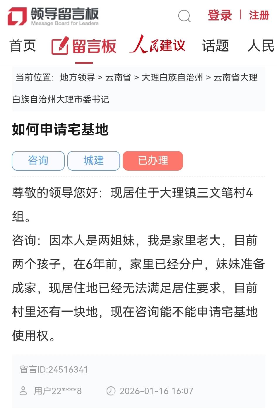 大理网民向市委书记农村居民如何申请宅基地🕍建房❓ 近日大理网民通过人民网领导留言板给市委书记留言: ✍📩如何申请宅基地❓ 尊敬的领导您好:现居住于大理镇三文笔村4组。 咨询:因本人是两姐妹,我是家里老大,目前两个孩子,在6年前,家里已经分户,妹妹准备成家,现居住地已经无法满足居住要求,目前村里还有一块地,现在咨询能不能申请宅基地使用权。 📢📩官方回复;2026-02-25 19:01 大理市大理镇 您通过人民网领导留言板咨询现行申请宅基地建房政策的留言收悉,大理市人民政府于2026年1月20日转我镇办理,现将有关情况答复如下: 您属大理镇三文笔村委会第四村民小组村民,现家庭成员5人,于2020年与胞妹进行了分户,您父亲与胞妹分为一户、母亲与您分为一户。现居住房屋位于三文笔完小北侧,为砖混结构三层,建筑面积为356.94㎡。 关于您所咨询的家里有一块地是否能申请建房的问题。经核实,该宗地位于三文笔完小西边,地块规划用途为城镇住宅用地。宅基地 农村自建房 根据《大理市国土空间总体规划(2021-2035年》,三文笔村属中心城区规划建设用地范围,并涉及崇圣寺三塔国家级文物保护单位文物建设控制地带范围。根据大理市人民政府《关于大理市中心城区个人建房管控的意见》(大市政发〔2021〕18号)文件要求,“管控范围内一律不再新审批宅基地”。 大理自然资源所、大理镇农综组、三文笔村委会工作人员于2026年2月11日现场与您进行了面谈,对现行政策规定已详细告知。感谢您的支持和理解!农村宅基地制度 宅基地流程 宅基地办理流程 宅基地申请标准 宅基地管控 农村宅基地试点 宅基地合法申请 宅基地建房规定