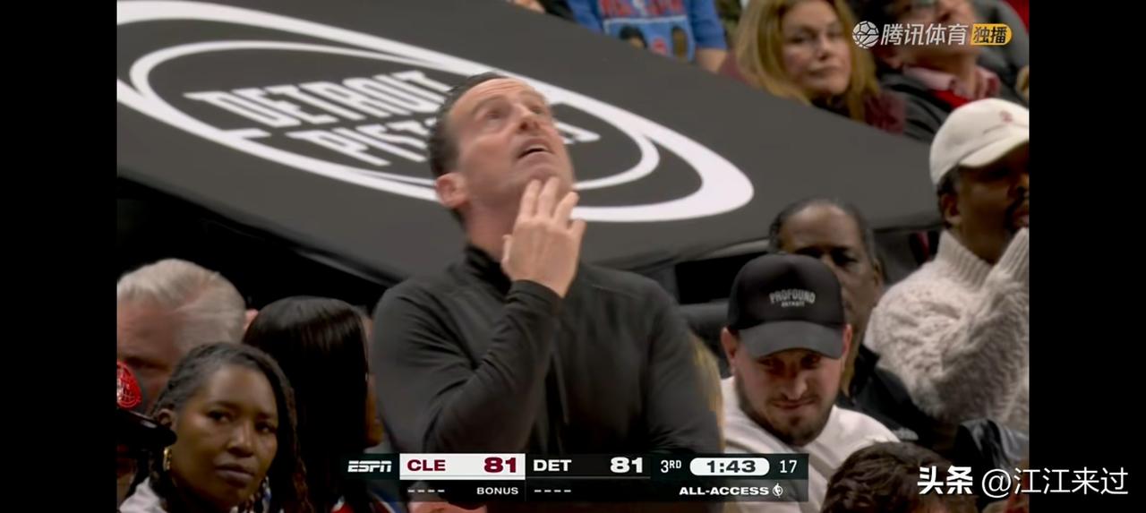 骑士对阵活塞第三节突然场馆音响出现问题!暂停比中场还长!骑士能否通过这一小插曲得到充分休息?活塞65比64正要起势,结果被自己主场掐灭了起势的势头! 骑士在哈登、米切尔、韦德、埃利斯4大主力不打的情况下,三节比赛结束,骑士仅仅84比85落后活塞1分!