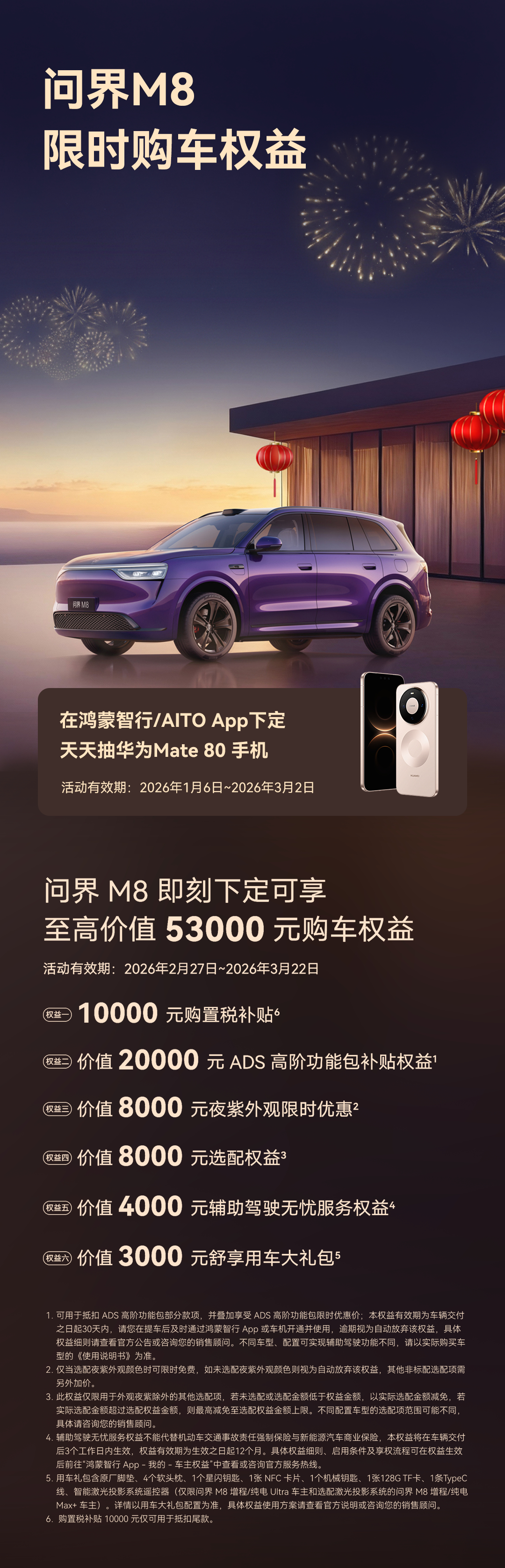 问界M7和M8都开启了限时万元购置税补贴活动,2月27-3月22。M7最高可享7万元权益,M8最高可享5.3万元权益。现在下定,最快可以1-2周交付,速度也是很快了。最近M7的产能应该也是爬上来了很多,这几天看到好多新交付的。前天刚出门5分钟,路上就看到了4台新款的M7,3台还都是刚交付没上牌的。
