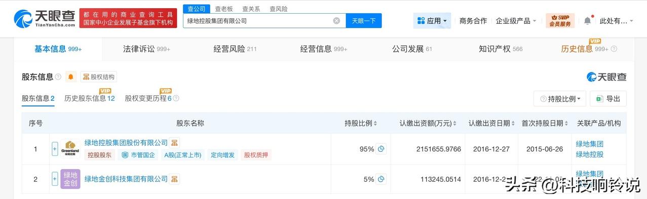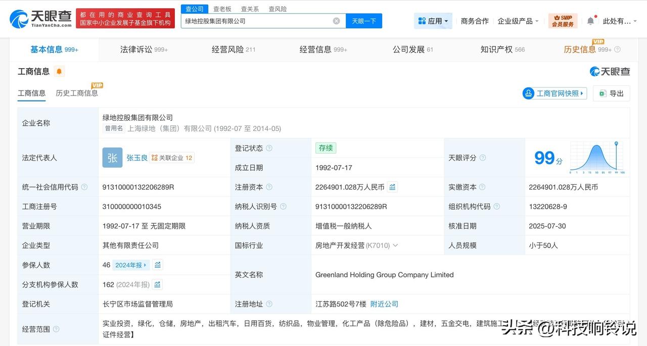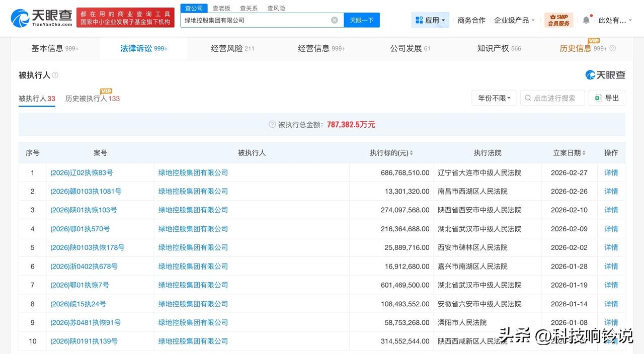 【绿地控股集团等被恢复执行6.8亿】 天眼查法律诉讼信息显示,2月27日,绿地控股集团有限公司、沈阳安邦置业发展有限公司、盘锦绿地置业有限公司等新增一则恢复执行信息,执行标的6.8亿余元,执行法院为辽宁省大连市中级人民法院。 绿地控股集团有限公司成立于1992年7月,法定代表人为张玉良,注册资本约226.5亿人民币,经营范围为实业投资、绿化、仓储、房地产等,由绿地控股(600606)、绿地金创科技集团有限公司共同持股。风险信息显示,该公司现存30余条被执行人信息,被执行总金额超78亿元,此外,该公司还存在失信被执行人(老赖)、终本案件及多条股权冻结信息。 天眼查信息: