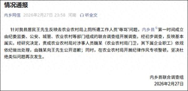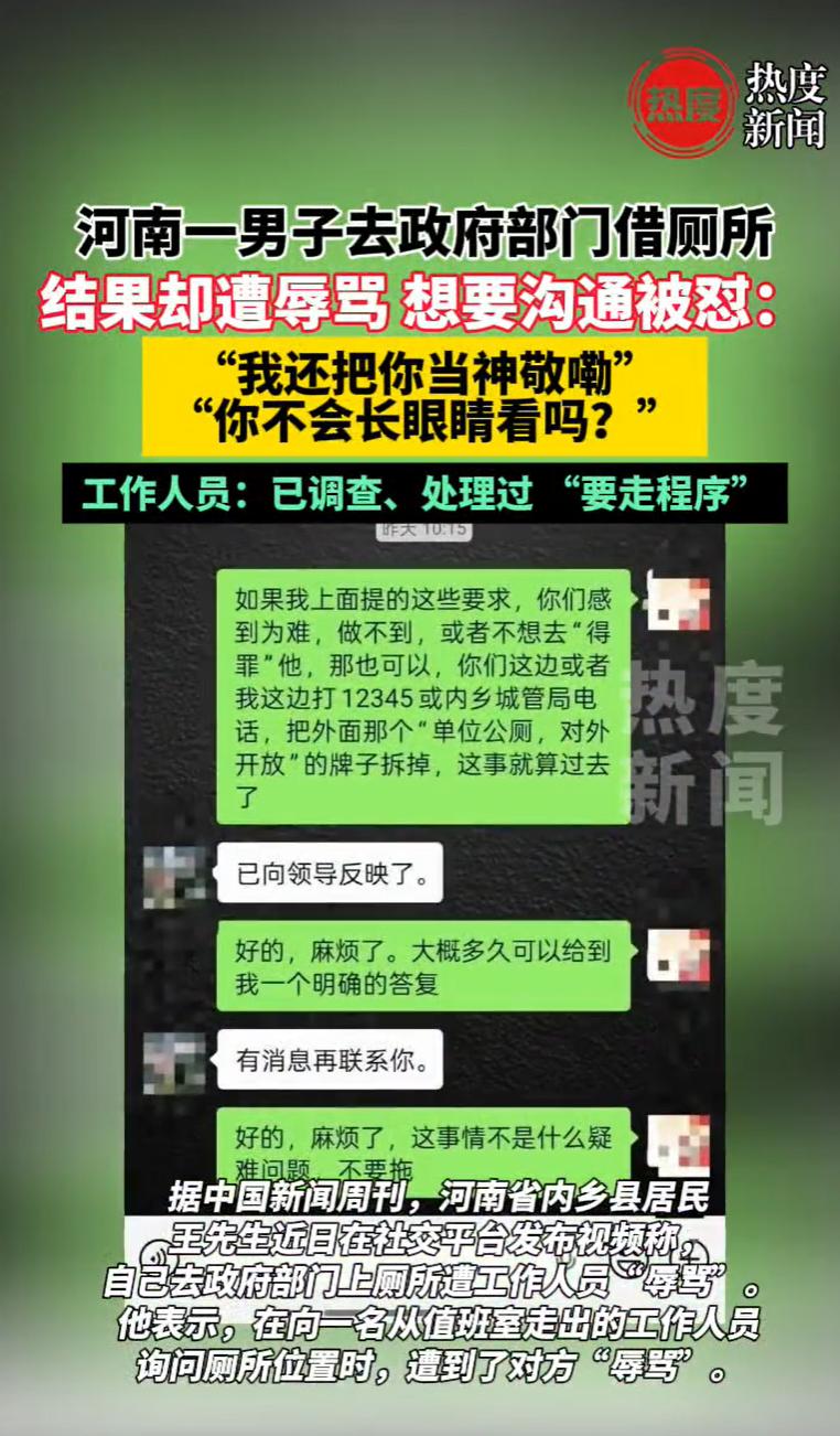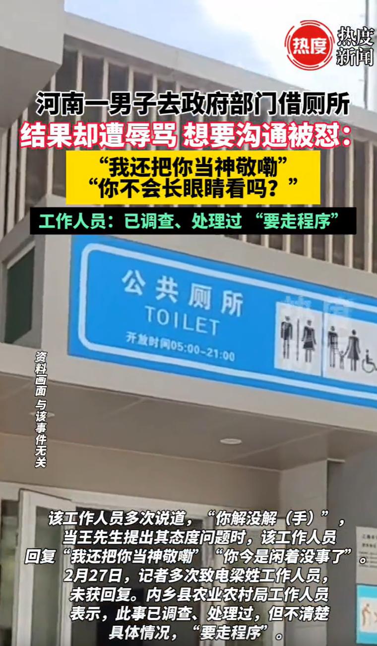 河南内乡,一男子早上买完菜急着找厕所,瞅见农业农村局门口挂着“单位公厕,对外开放