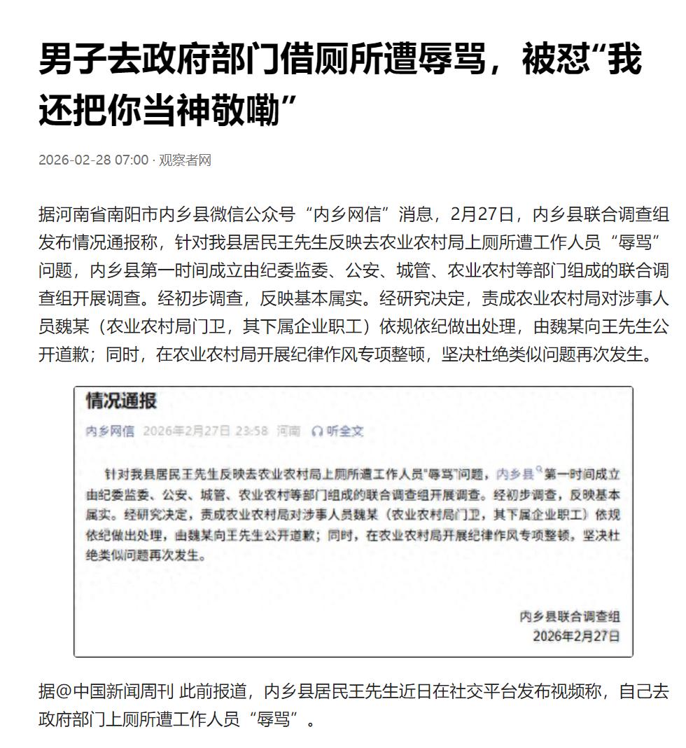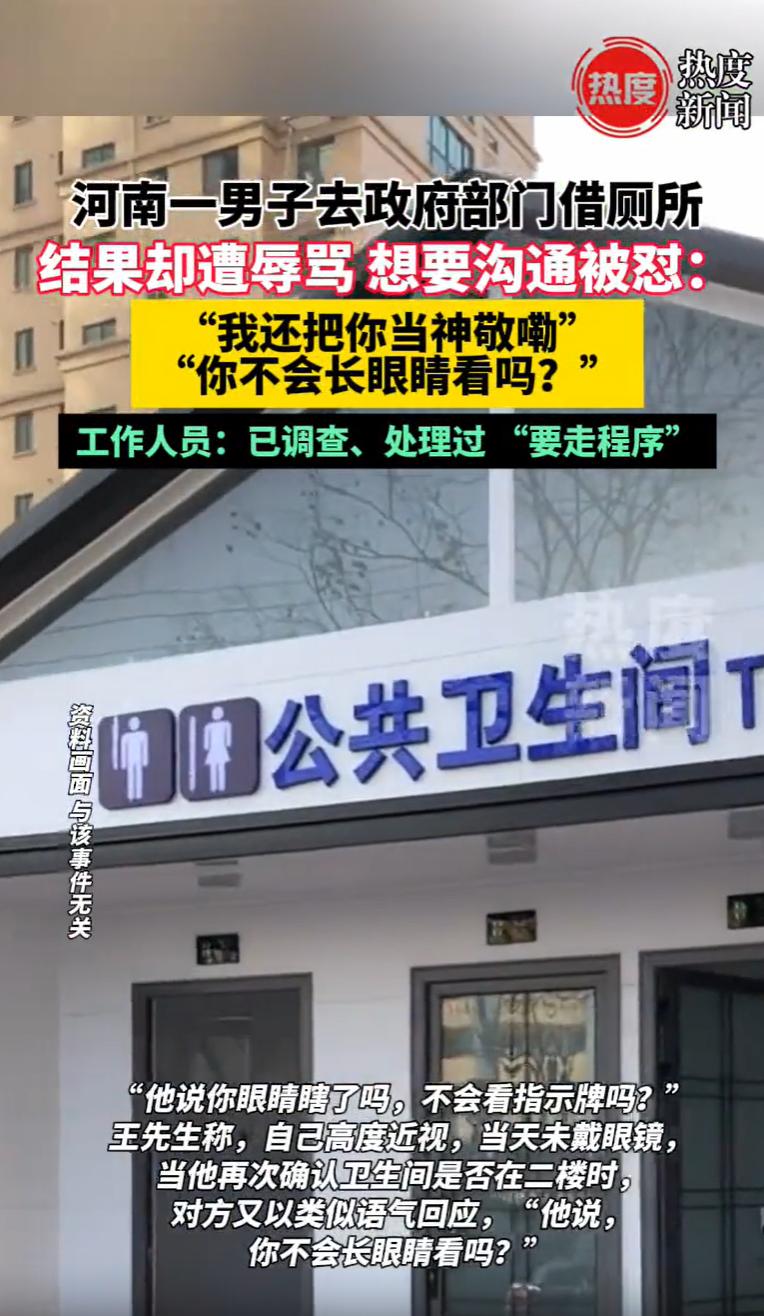 河南内乡,一男子早上买完菜急着找厕所,瞅见农业农村局门口挂着“单位公厕,对外开放”的牌子,赶紧进去。刚想问路,值班的师傅张嘴就是硬话:“你眼瞎了?不会自己看?”男子憋着火又问是不是在二楼,那人更冲:“你不会长眼看?”上完厕所出来,男子想说道说道,对方没搭腔,直接按遥控关大门,想把人堵院里。男子举手机拍,门才又开了。那人还甩一句:“我还把你当神敬嘞?”视频上网炸了锅,官方连夜查,认定骂人基本属实。   2026年2月14日,居民王先生,像往常一样去县城买菜。   买完菜,可能是早上的稀饭喝多了,或者路上走急了,他突然感到一阵内急,这滋味,相信大家都懂,那真是火烧眉毛,刻不容缓。   这时候,王先生看到了路边一个牌子,上面写着“单位公厕,对外开放”,牌子指向的单位,是县农业农村局。   看到这个牌子,王先生就像看到了“救星”。   他没多想,拎着菜,快步走进了院子,径直走向主楼,想找个卫生间解决一下“燃眉之急”。   王先生可能因为没戴眼镜,进楼后一时没看清厕所的具体位置。   这时,他从值班室看到一位工作人员魏某走了出来。   王先生赶紧上前,非常客气地询问:“您好,请问厕所在哪儿?”   不料,魏某非但没有给予指引,反而用一种非常生硬和不耐烦的语气回了一句:“你眼睛瞎了吗?不会看指示牌吗?”   王先生虽然心里不爽,但只好强压着不快,又多问了一句:“那厕所是在二楼吗?”   魏某的回应更加强硬和带有侮 辱 性:“你不会长眼睛看吗?”   王先生憋着一肚子火,先解决了内急。   等他上完厕所出来,觉得这事不能就这么算了,牌子写着对外开放,自己来借用厕所,凭什么要受这份窝囊气?   他想找魏某理论理论,讨个说法。   但魏某似乎并没有沟通的意思,没有正面回应。   更戏剧性的一幕是,当王先生准备离开,走到院子大门口时,魏某竟然操作电动推拉门,试图把门关上,把王先生困在院子里。   这一下,王先生的火“噌”地一下就上来了。   他掏出手机开始拍摄视频,要曝光这种行为。   看到王先生举起了手机,魏某可能意识到事情闹大了,才又把门打开。   但在随后的争执中,魏某又爆出了一些让人哭笑不得的“金句”。   面对王先生对其态度的质问,魏某理直气壮地说:“我还把你当神敬嘞!”   言下之意,能让你进来上厕所就不错了,你还想让我把你供起来?   当王先生坚持要讨个说法时,魏某又甩出一句:“你今是闲着没事了!”   意思是王先生是故意找茬,没事找事。   王先生的视频发到网上后,迅速引起了广泛关注。   事情发酵得很快,当地相关部门迅速介入调查。   2月28日,调查组的通报就出来了,确认反映基本属实,查实涉事人员魏某是“农业农村局门卫,其下属企业职工”。除要求他向王先生“公开道歉”,还让单位整改。   有人说,憋得火烧眉毛的时候,就盼着找个地方解决,结果碰上这么个‘门神’,那句‘眼瞎了’换谁听了不冒火?   也有人说,这事看着小,其实是个大问题,在单位门口站着的,不管是正式工还是临时工,都代表着单位形象。   更有人说,估计门卫也是天天坐那儿无聊,突然来个问路的,脾气没搂住。   本案中,魏某那句“你眼瞎了”,不是简单的态度差。   根据《民法典》第109条,人格尊严受法律保护;第1024条也明确规定,不得以侮辱方式侵害他人名誉权。   魏某当着人面骂人,不光让王师傅心里堵得慌,也贬低了他作为正常人的社会评价。   从法律上讲,这已经涉嫌对王师傅人格权的侵害,魏某该赔礼道歉。   此外,魏某试图关闭大门阻止王先生离开的行为,涉嫌治安违法。   《治安管理处罚法》第四十七条规定,有下列行为之一的,处十日以上十五日以下拘留,并处一千元以上二千元以下罚款;情节较轻的,处五日以上十日以下拘留,并处一千元以下罚款:……(三)非法限制他人人身自由、非法侵入他人住宅或者非法搜查他人身体的。   具体到本案,魏某关闭大门的行为,客观上造成了王先生无法离开该院子的状态,属于非法限制他人人身自由。   虽然门很快又开了,没构成刑事上的非法拘禁罪,但非法限制不以持续时间长短为唯一判断标准,只要实施了限制行为,且没有合法依据,就可能构成违法。   这意味着,魏某依法面临治安处罚可能。   那么,魏某是下属企业职工,不是农业农村局的正式编制,这责任该谁担?   《民法典》第一千一百九十一条第二款规定,劳务派遣期间,被派遣的工作人员因执行工作任务造成他人损害的,由接受劳务派遣的用工单位承担侵权责任。   魏某当时在值班,干的就是门卫的活儿,他骂人、关门都发生在工作期间,   所以,不管他合同签在哪儿,农业农村局作为用人单位或用工单位,都得先替他把责任扛下来,赔偿道歉完事儿再内部追偿。   对此,您怎么看?