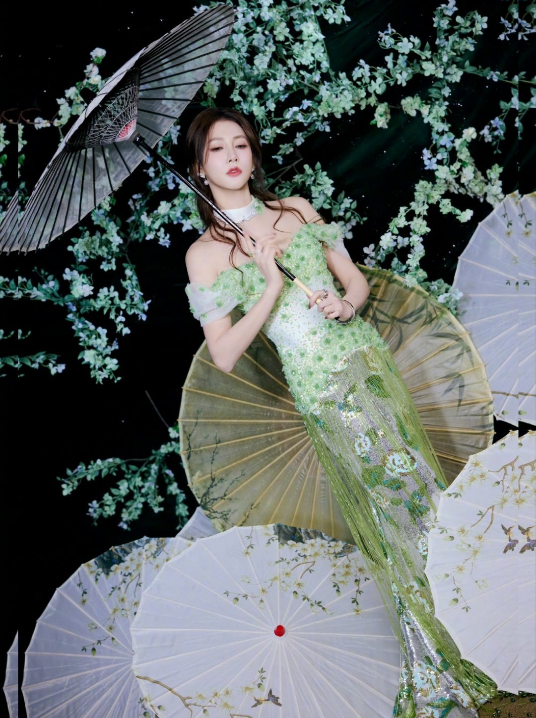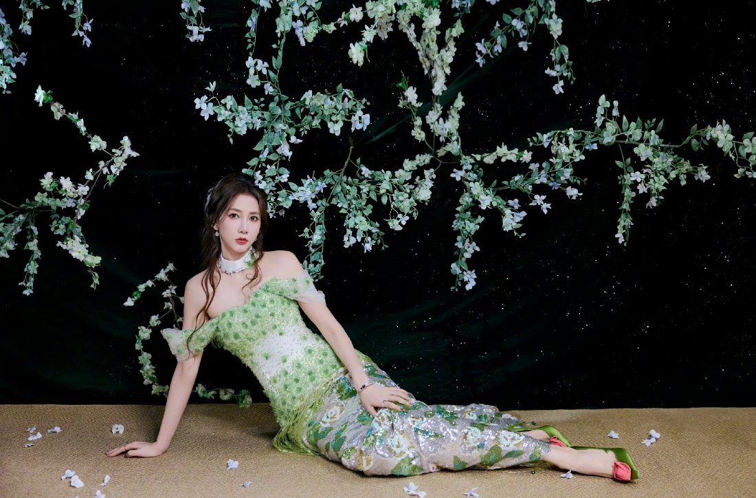 弦子~绿色纱裙,衬得气质好绝期待姐姐在节目里的精彩演唱