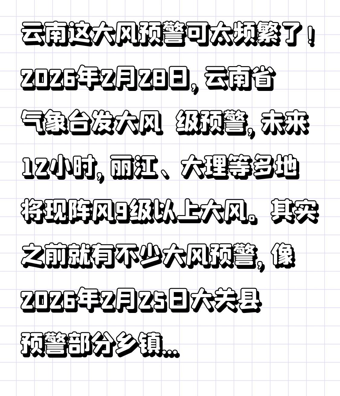 云南这大风预警可太频繁了! 2026年2月28日,云南省气象台发大风Ⅳ级预警,未来12小时,丽江、大理等多地将现阵风9级以上大风。 其实之前就有不少大风预警,像2026年2月25日大关县预警部分乡镇将有8级以上阵性大风,2022年2月28日安宁市也预警当地平均风力可达6级,阵风7 - 8级。 大风天可真危险,广告牌、临时搭建物都可能被吹落。大家一定要听劝,别在这些危险的地方逗留,相关部门也得赶紧做好防大风工作,关好门窗、加固物品啥的,保障安全。