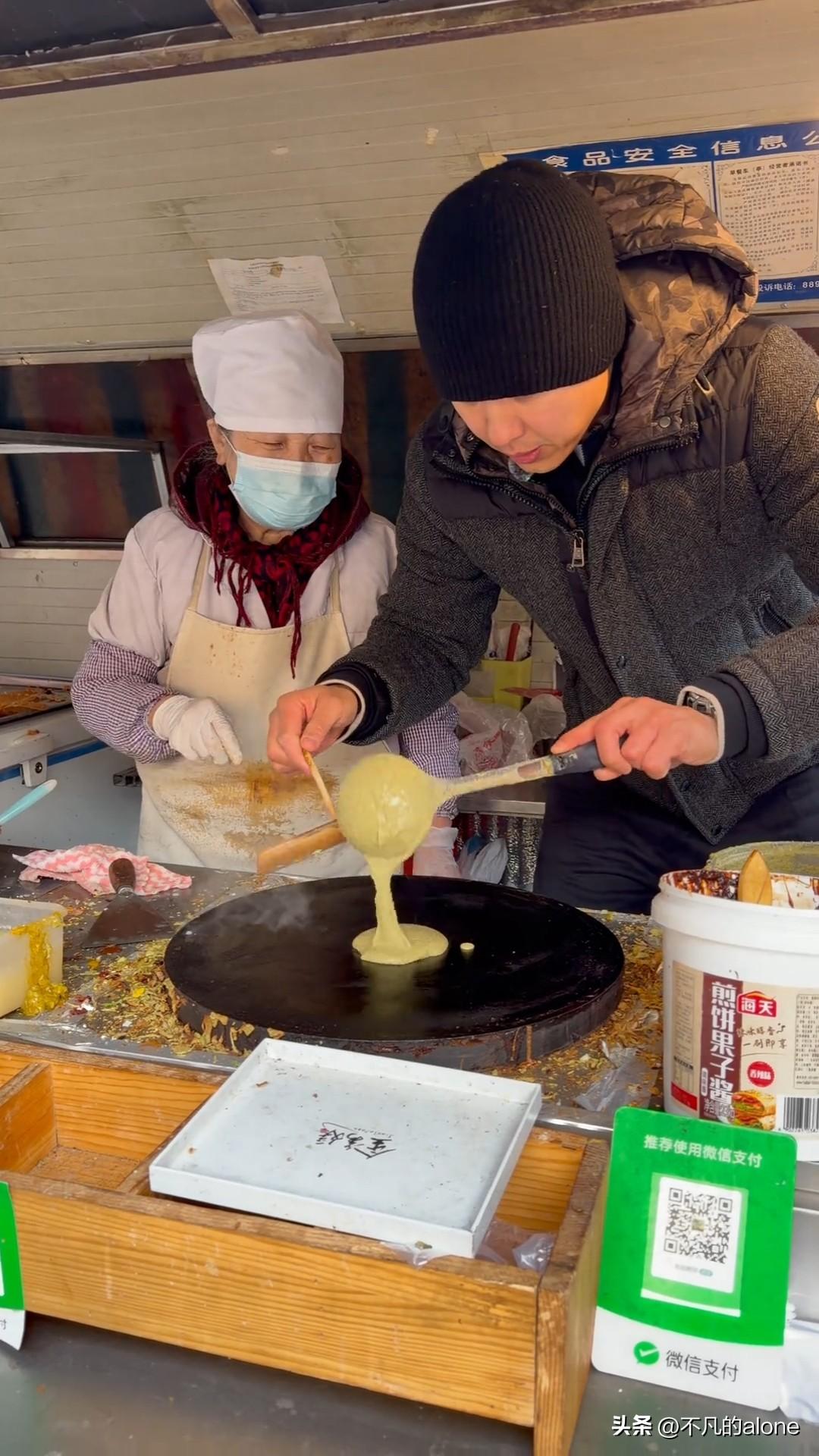 2月28日,高云翔更新生活日常vlog,他与发小相约一起吃早餐,两人吃的是天津特色小吃——煎饼果子。 高云翔身披深色防寒服,内搭白色T恤,头戴黑色圆帽,他还特地把胡子剃了,整个人看起来非常帅气。 这家小吃摊位的煎饼果子只需要“5.5元一个”,但需要自己带鸡蛋,老奶奶从1994年就开始做煎饼果子了。 高云翔真的好健谈,他表示自己也“下岗了”,让老奶奶教他摊煎饼果子。 高云翔还真有天赋,拿起工具就开始操作,自己亲手给发小做了个煎饼果子,并得到了对方不错的评价。 大家有吃过天津小吃煎饼果子吗?
