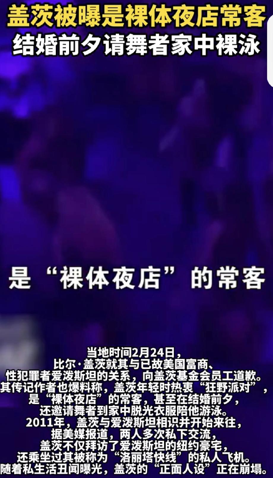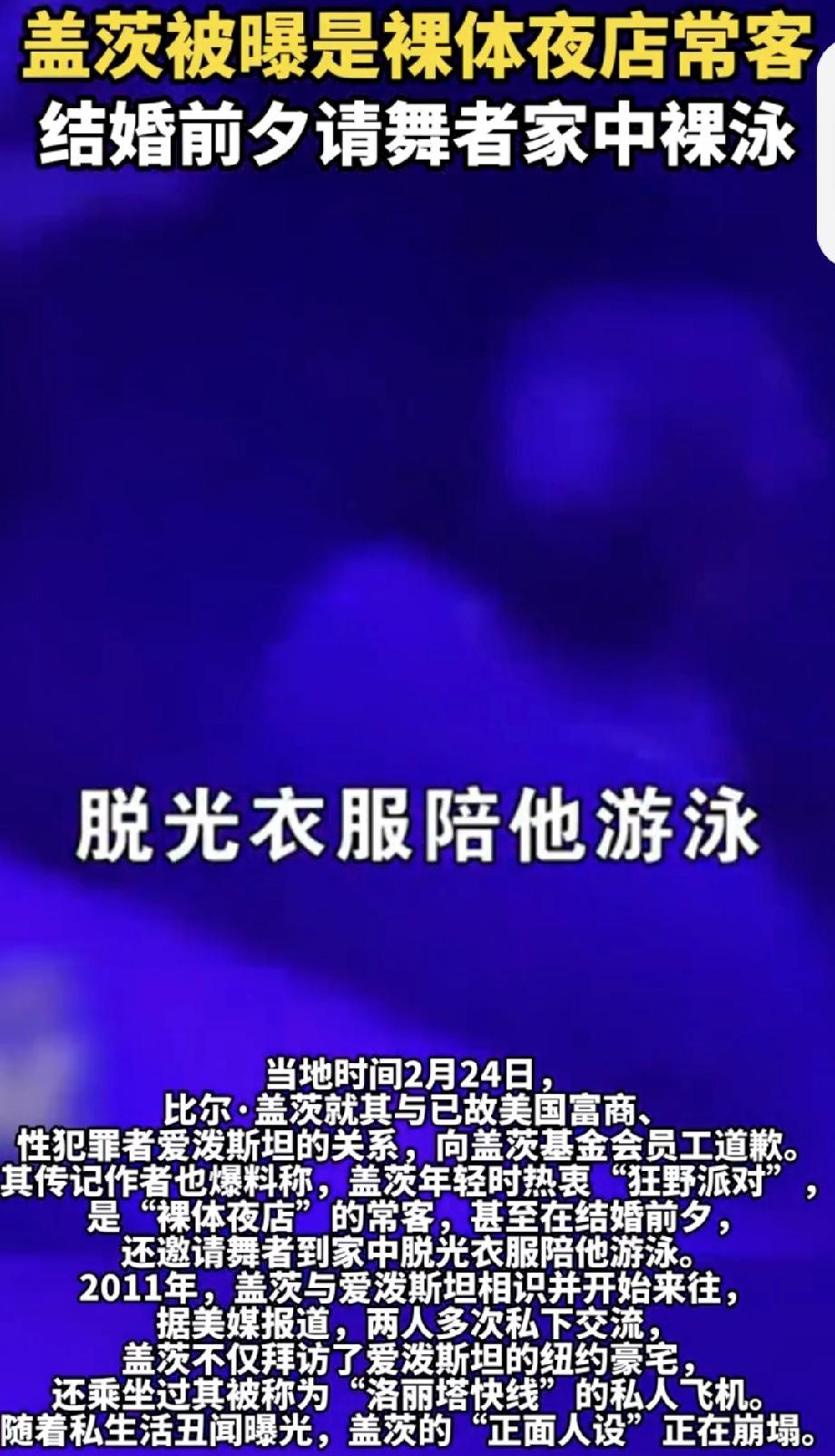 盖茨被曝结婚前夕请舞者家中裸泳 盖茨这次可真是人设崩塌啊!据《环球人物》报道,当地时间2月24日,他向盖茨基金会员工道歉,承认有两段婚外情。谁能想到,那个被视为“技术宅”的盖茨,年轻时竟如此狂放。1977年,20岁的他开保时捷超速、闯红灯,还没驾照,被捕后还把照片印在信用卡上。其传记作者爆料,他是“裸体夜店”常客,结婚前夕还请舞者家中裸泳。2011年,他还和性犯罪者爱泼斯坦来往密切。曾经的“正面人设”,在这些私生活丑闻面前,碎了一地。