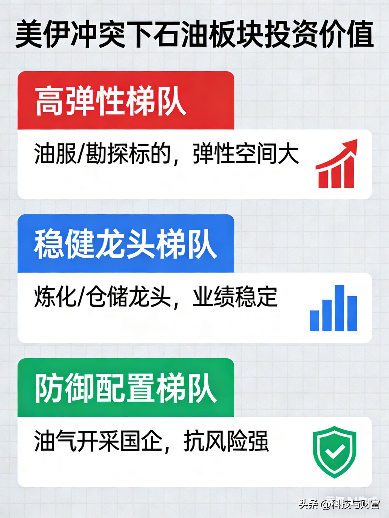 要赚钱找石油,美伊周末紧张,石油复制黄金涨势?别乱追!最全产业链龙头+3级梯队,精准抄作业! 一张图看懂中国石油产业链:上游→中游→下游,核心龙头+投资逻辑 近期美伊地缘紧张持续发酵,霍尔木兹海峡航运风险抬升,原油价格迎来明显风险溢价,整个石油天然气板块迎来阶段性催化。 很多朋友想布局,却分不清产业链上下游、谁是真龙头、谁弹性大、谁更稳健。今天一次性把A股石油全产业链+核心标的+投资价值讲透,简单直白,新手也能看懂。 一、上游勘探开采:油价最直接受益(弹性核心) 上游是原油源头,油价上涨,利润直接增厚,是本轮地缘行情核心受益环节。 • 中国海油(600938):海上油气绝对龙头,桶油成本极低,海外布局广,高股息+业绩稳,中长期配置首选。 • 中国石油(601857):国内产量第一,天然气市占率高,全产业链对冲周期,大盘稳压器。 • 中曼石油(603619):民营弹性标的,海外项目集中,小市值+油价敏感度高,短线爆发力强。 • 洲际油气(600759):海外油气资产为主,油价每上涨1美元,利润弹性极大,人气标的。 • 广汇能源(600256):LNG+综合能源,业绩稳定,兼具成长与防御属性。 小结:大国企稳,民企弹性大,根据风险偏好选择即可。 二、中游油服+工程:上游扩产的“卖铲人” 油价上行,开采企业加大资本开支,油服、设备、海洋工程订单同步回暖。 • 中海油服(601808):海上油服龙头,与中国海油深度绑定,行业景气度直接受益。 • 杰瑞股份(002353):压裂设备龙头,技术壁垒高,利润率稳定,成长属性突出。 • 海油工程(600583):海洋油气工程总包龙头,订单确定性强,估值偏低。 • 石化油服(600871):中石化系陆地油服,体量最大,业绩随行业周期波动。 三、中游油运:地缘冲突特殊受益(弹性极强) 霍尔木兹海峡若通行受限,油轮运距拉长、运价暴涨,油运是本轮行情黑马赛道。 • 中远海能(600026):VLCC大型油轮龙头,中东航线占比高,运价弹性天花板最高。 • 招商轮船(601872):油运+干散货双主业,稳健性强,波动更小。 • 招商南油(601975):内贸油运为主,走势温和,适合稳健资金。 四、下游炼化+销售:一体化龙头抗周期 油价上涨抬升原料成本,但全产业链一体化公司可对冲风险,防御属性更强。 • 中国石化(600028):全球炼化龙头,加油站+炼化+上游全覆盖,高股息防御首选。 • 荣盛石化(002493):民营炼化龙头,全产业链配套,成本优势明显。 • 恒力石化(600346):大炼化一体化标杆,业绩韧性强,行业复苏优先受益。 三、投资价值三梯队(最核心,建议收藏) 🔥第一梯队(高弹性,短线优先) 中远海能、中曼石油、洲际油气 → 小市值+地缘直接催化,涨幅爆发力最强。 📈第二梯队(稳健龙头,中长期) 中国海油、中国石油、中海油服、杰瑞股份 → 龙头壁垒高、现金流稳、高股息,适合拿得住的资金。 🛡️第三梯队(防御配置,低波动) 中国石化、广汇能源、海油工程 → 全产业链对冲风险,大盘震荡时更抗跌。 风险提示 1. 美伊局势快速缓和,油价回落,板块会同步回调; 2. 全球经济走弱,原油需求端承压; 3. 部分弹性标的短期涨幅较大,注意高位波动风险。 整体来看,石油板块当前具备地缘+周期双重催化,分清上下游、选对梯队,更容易把握节奏。 大家更看好油运、上游开采,还是炼化板块?评论区聊聊。国际石油走势 油气板块分析 石油价格走向