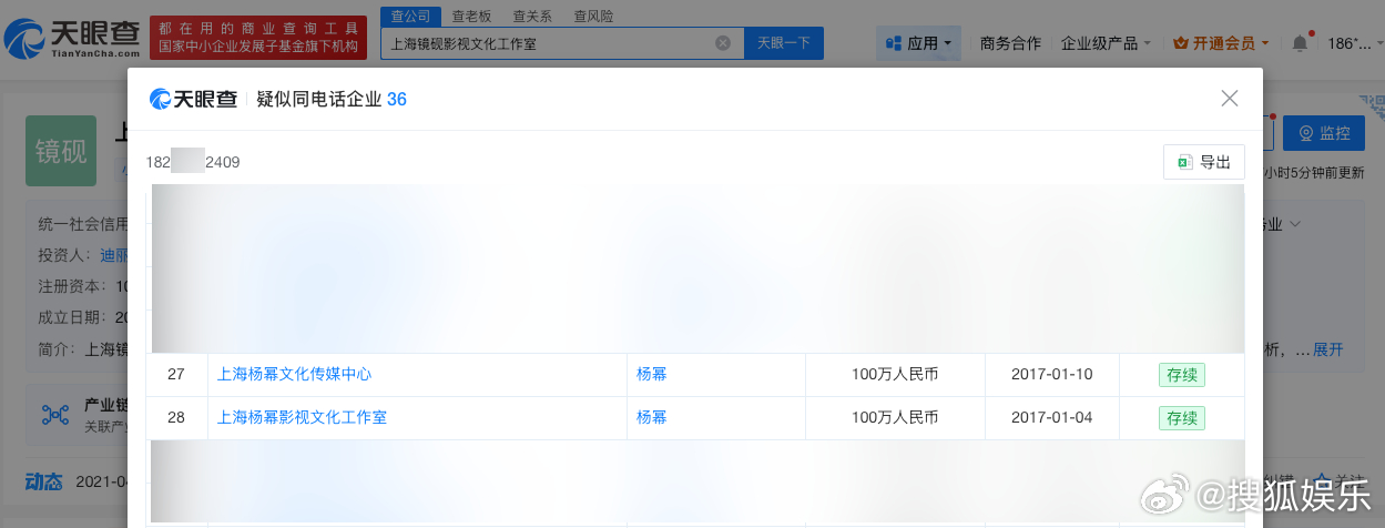 另外,北京天伊娱乐有限公司与上海杨幂文化工作室共用一个邮箱和电话。迪丽热巴名下上海镜砚影视文化工作室等与杨幂名下上海杨幂文化传媒中心、上海杨幂影视文化工作室年报公示电话也相同。