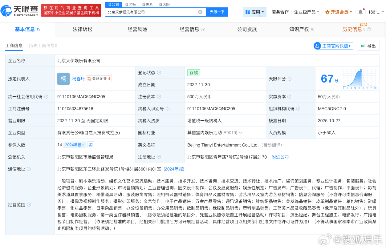 天眼查工商信息显示,天伊娱乐关联北京天伊娱乐有限公司成立于2022年11月,法定代表人为杨春玲,注册资本500万人民币,经营范围包括剧本娱乐活动、组织文化艺术交流活动等。股东信息显示,该公司由杨幂母亲杨春玲、诗摇、共青城尘星及月投资有限公司共同持股。