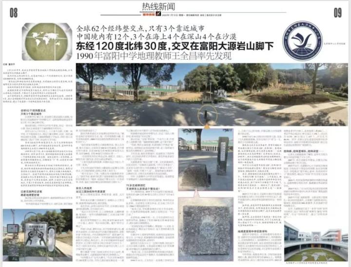 2026年1月19日,都市快报用大量篇幅,深度报道了学校王全昌老师在1990年率先发现的东经120度北纬30度整交点,该点位于富阳区大源镇西南约400米的岩山脚下,1995年9月下旬,浙江省测绘局利用全球定位系统精准测定,同年10月5日,国家测绘局批准建立我国第一个经纬度整数点标志塔。这一整交点被誉为“我国唯一一个人口密集区的整交点”,使其成为公众和地理爱好者最容易抵达的"大地测量的现实地标"。