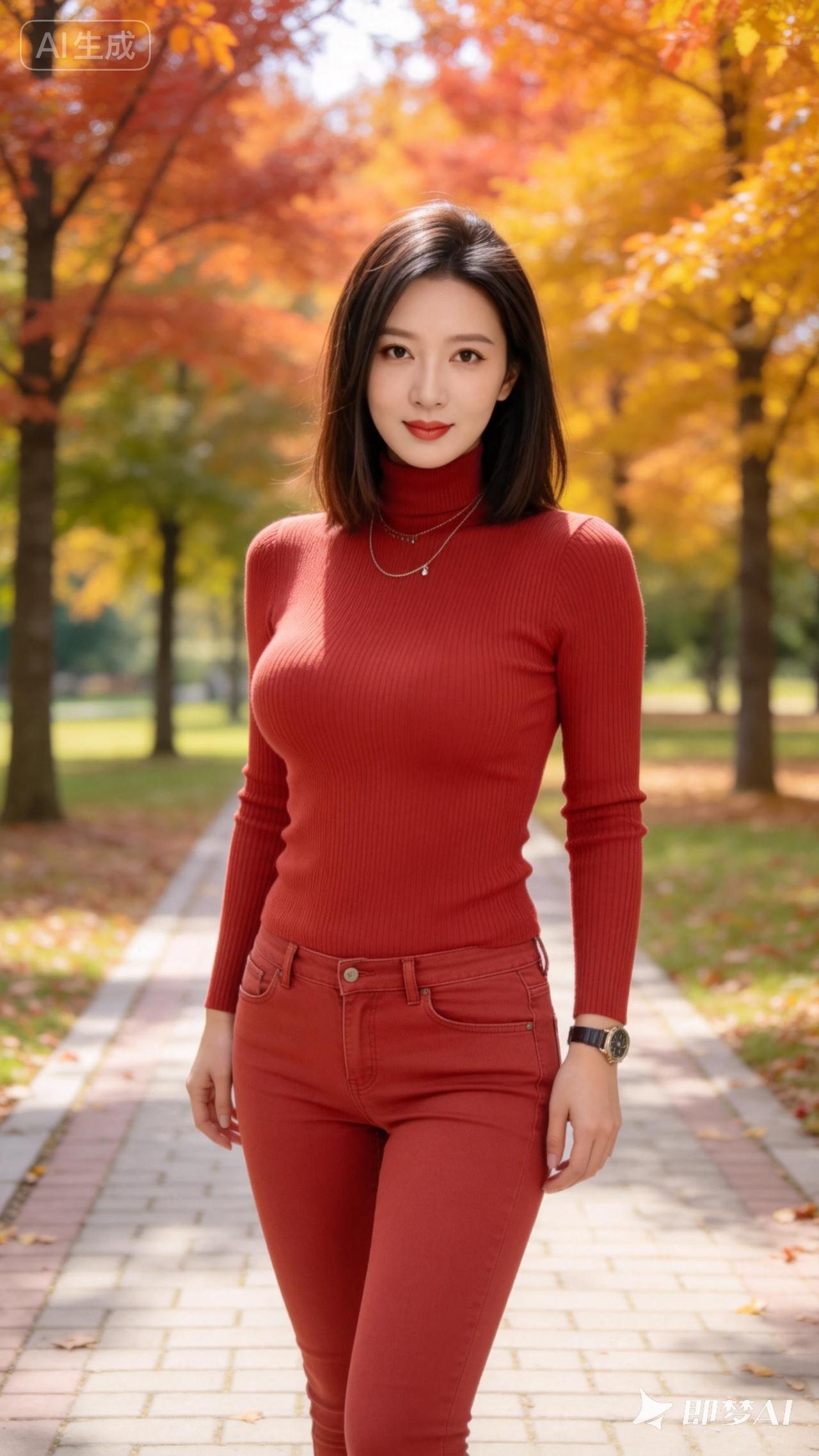 秋日穿搭指南:红衣少女漫步在落叶小径上🍂🍁