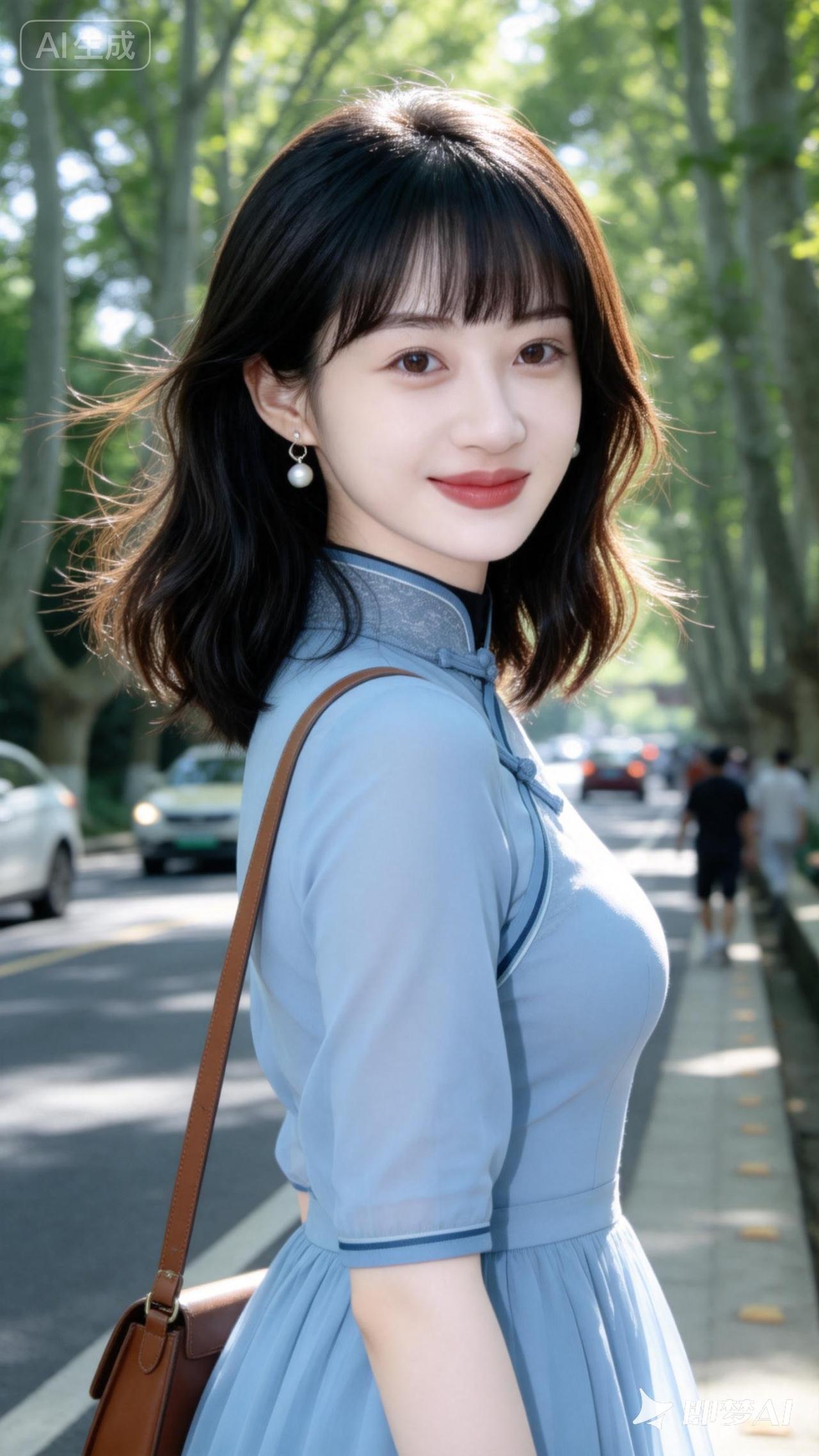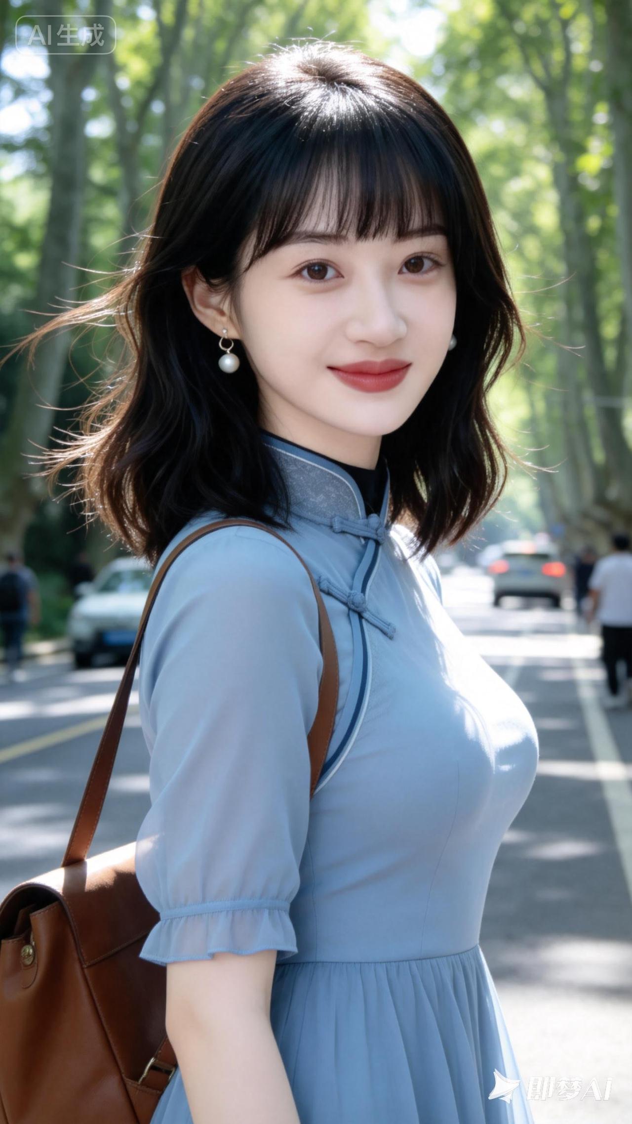 阳光下的甜美少女,轻盈的蓝裙与自然背景相映成趣。