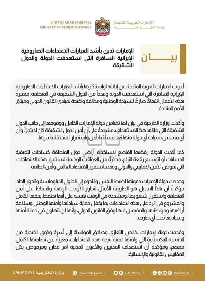 阿联酋外交部声明: “阿拉伯联合酋长国对伊朗公然向阿联酋和该地区其他几个兄弟国家发动导弹袭击表示最强烈的谴责和谴责,认为这些行为公然侵犯了国家主权,明显违反了国际法原则和《联合国宪章》。 外交部在一份声明中重申,阿联酋完全声援并支持遭受这些袭击的兄弟国家,强调兄弟国家的安全不可分割,任何侵犯其中一个国家主权的行为都是对整个地区安全与稳定的侵犯。 阿联酋重申,坚决反对将本地区国家领土用作清算旧账或扩大冲突范围的场所,并警告称,此类侵犯行为若继续下去将造成严重后果,不仅破坏地区和国际安全,还会威胁全球经济稳定和能源安全。 阿联酋重申呼吁各方保持克制,诉诸外交途径和严肃对话,强调这是克服当前危机、维护地区安全和人民稳定的最佳途径。同时,阿联酋强调,它保留根据国际法,以保障其主权、国家安全、领土完整以及公民和居民安全的方式,对这些袭击做出回应的完全合法权利,并且在任何情况下都不会在维护自身安全和主权方面做出妥协。 阿联酋向在袭击中丧生的巴基斯坦遇难者家属和亲属表示诚挚的慰问和深切的同情,并表达了对他们的全力支持,同时重申,以平民和民用目标为攻击行为受到所有法律和人道主义标准的谴责和反对。