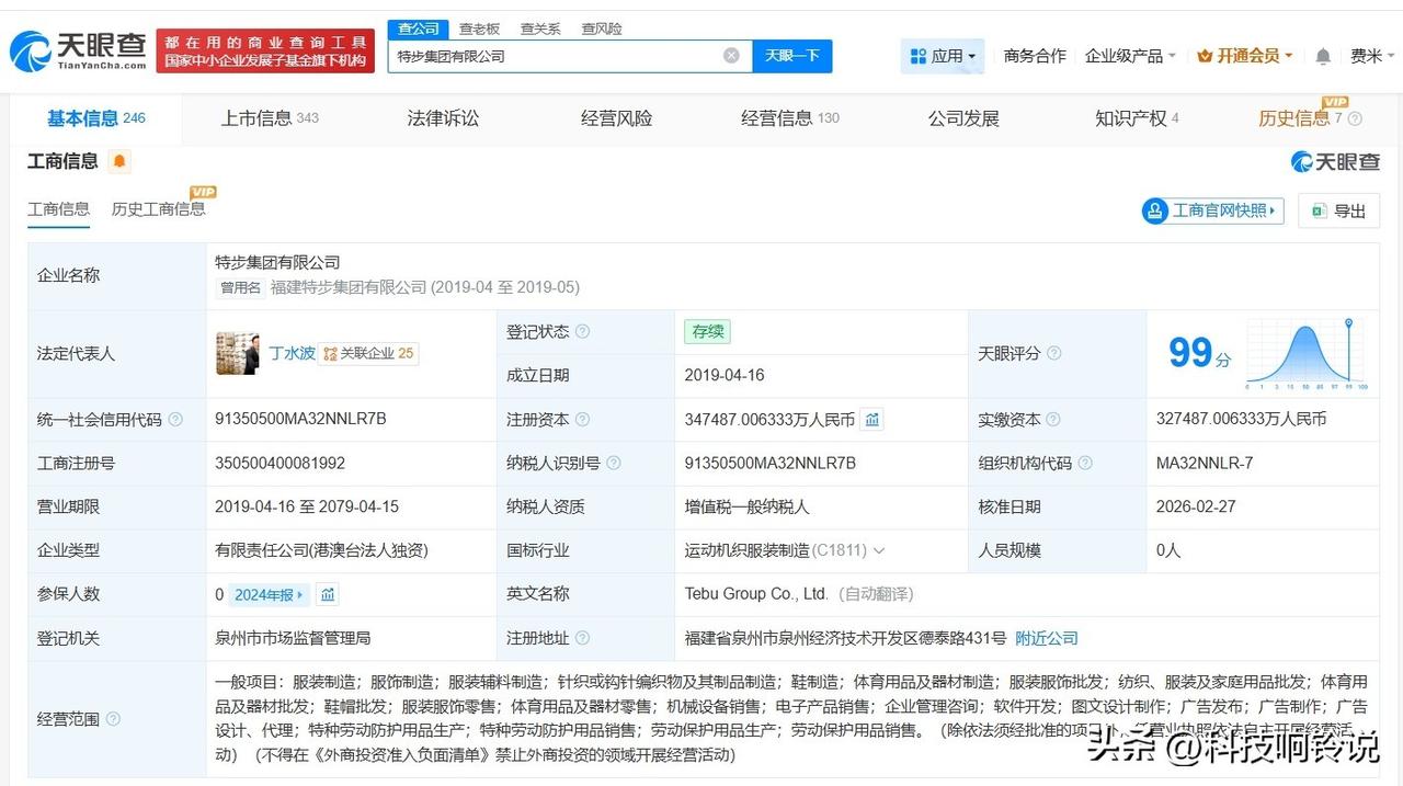 【特步集团增资至约34.7亿】 天眼查App显示,近日,特步集团有限公司发生工商变更,注册资本由约32.7亿人民币增至约34.7亿人民币。 该公司成立于2019年4月,法定代表人为丁水波,经营范围包括服装制造、鞋制造、体育用品及器材制造等,由香港特步企业有限公司全资持股。 天眼查信息: