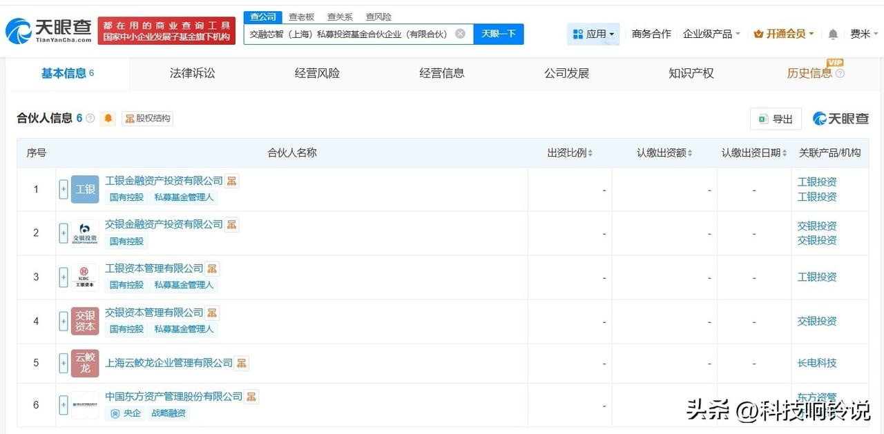 【长电科技、工银投资等在上海成立私募投资基金 出资额13.46亿】 天眼查App显示,2月28日,交融芯智(上海)私募投资基金合伙企业(有限合伙)成立,执行事务合伙人为交银资本管理有限公司、工银资本管理有限公司,出资额13.46亿人民币,经营范围为以私募基金从事股权投资、投资管理、资产管理等活动,创业投资,由工银金融资产投资有限公司、交银金融资产投资有限公司、长电科技(600584)旗下上海云鲛龙企业管理有限公司等共同出资。 天眼查信息: