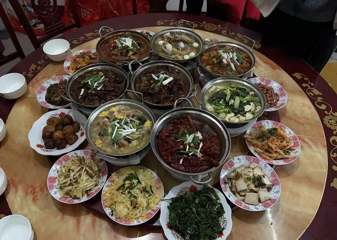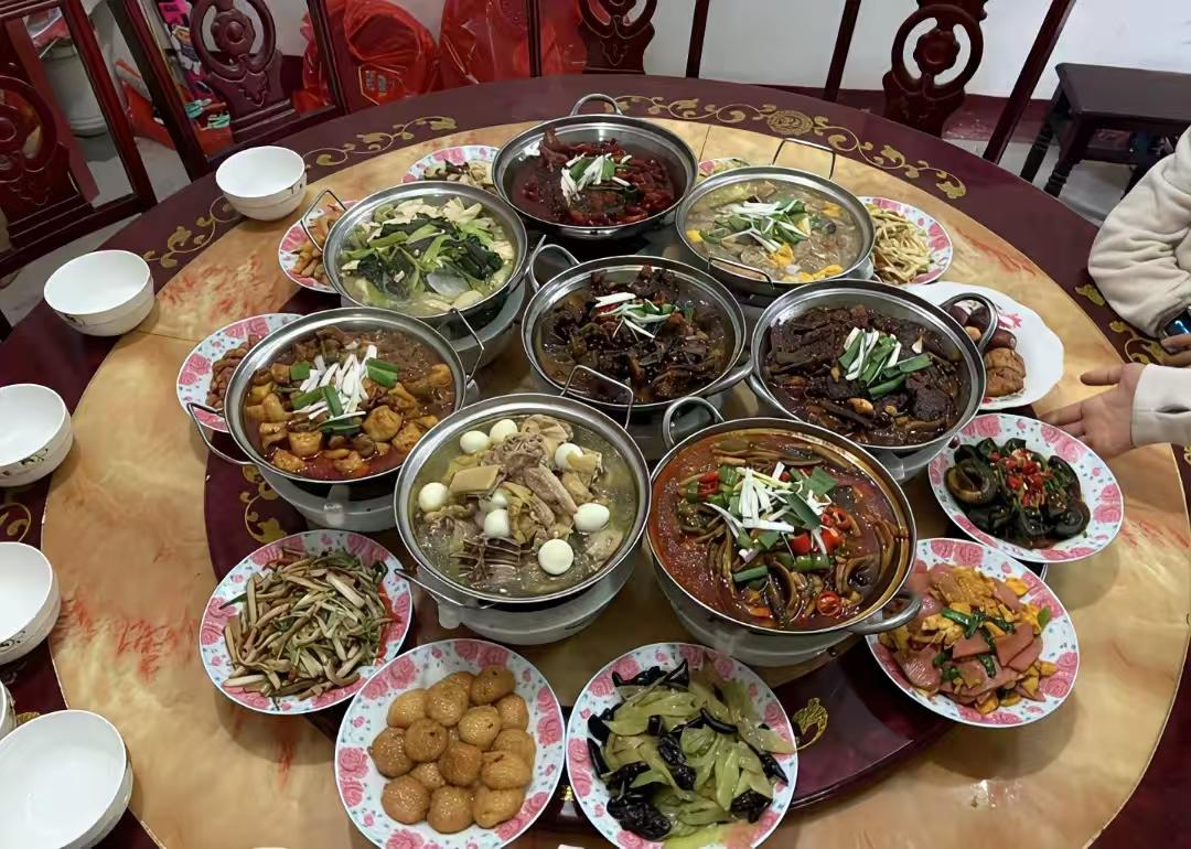 这应该是安徽的最高礼仪了吧?六安的菜,特点并不突出,名气也不大,但吃起来,下酒下饭都不错。 这锅子算顶配了,我们这正常也只有六个锅。我想知道的是,这份量的菜能吃完吗?剩菜怎么处理?做为奔七的人我十分期待。