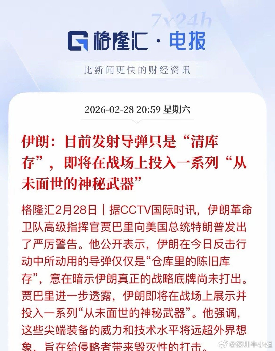 黑天鹅来袭,还是干起来了,买单肯定是要买,明天还有一天发酵,A股或许会稳点,港股或许遭受更大的压力,伊朗说现在只是在清之前的库存,已经发射导弹第七轮了,接下来就是大杀器了以美双方的共同作用,共同打击,伊朗也是强势反击,攻打美军基地,比特币已经率先大跌超3%了,周一全球资本市场肯定也会做出反应,资金肯定会避险,贵金属和资源肯定会给出反应,周期股走强,热门股和科技成长股就得承压,短期资金肯定会共振,今天开打,肯定不会是短期能直接结束的,但太长期美国也扛不住,毕竟美债问题还挂山顶上呢,希望伊朗扛住啊,拖住美国,库存清完,就得来真家伙了。