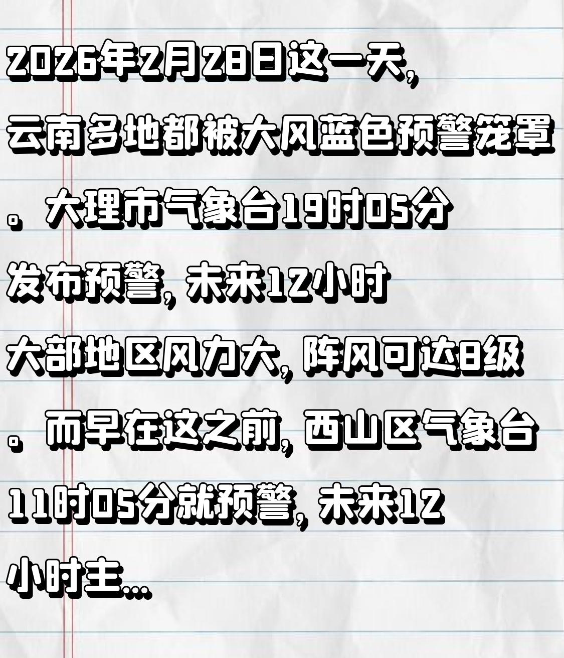 2026年2月28日这一天,云南多地都被大风蓝色预警笼罩。 大理市气象台19时05分发布预警,未来12小时大部地区风力大,阵风可达8级。而早在这之前,西山区气象台11时05分就预警,未来12小时主城区等多地将有6 - 7级以上大风;砚山县气象台12时53分也发布预警,当地未来12小时会出现8级以上大风。 这风是要吹遍云南多地啊!大家可得关好门窗,外出注意安全,别让大风把自己给“吹跑”咯。