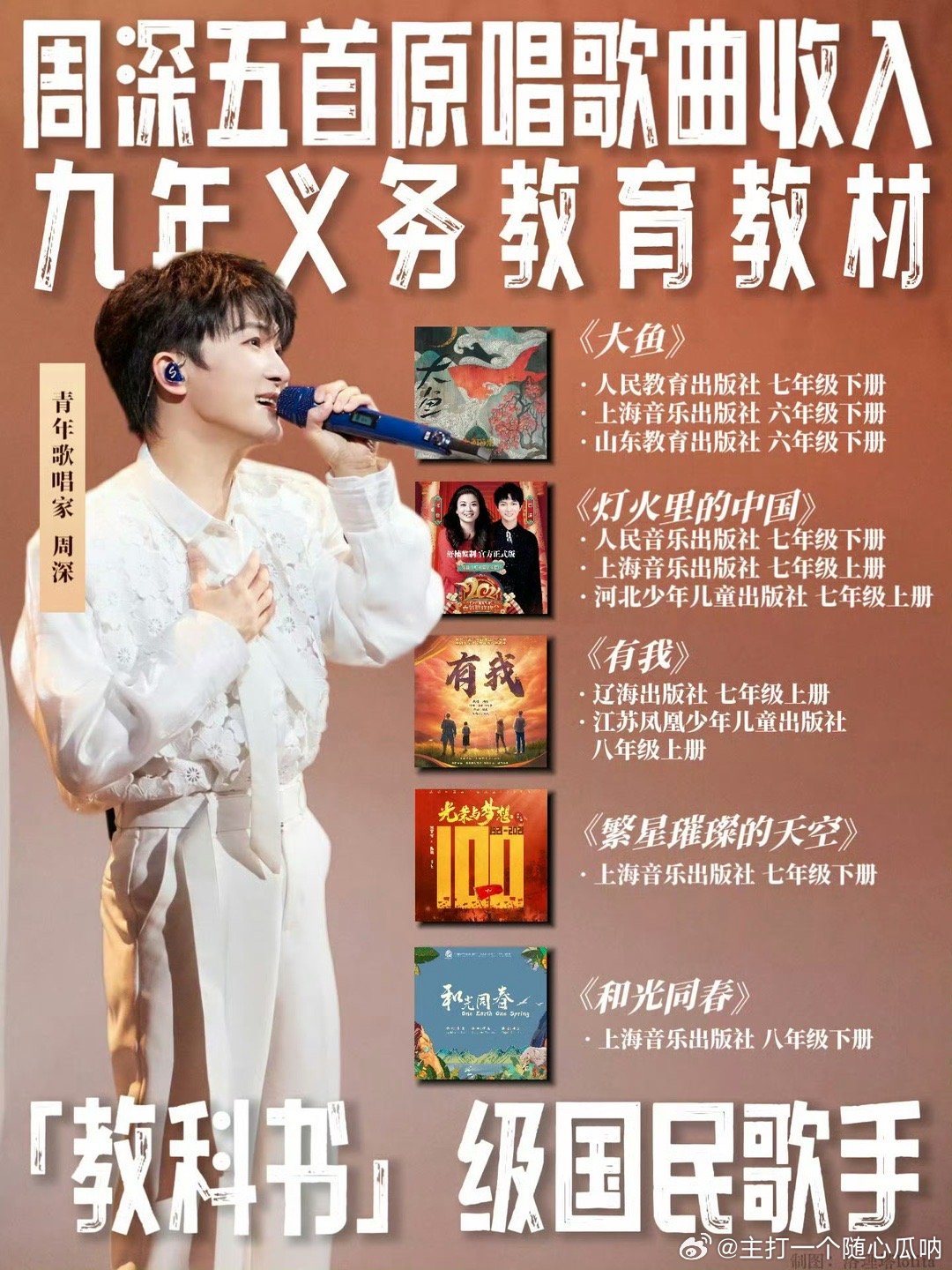 周深《和光同春》被收录到教材中去了,这已经是第五首原唱作品入九年义务教材了,好厉害,真是教科书级国民歌手!
