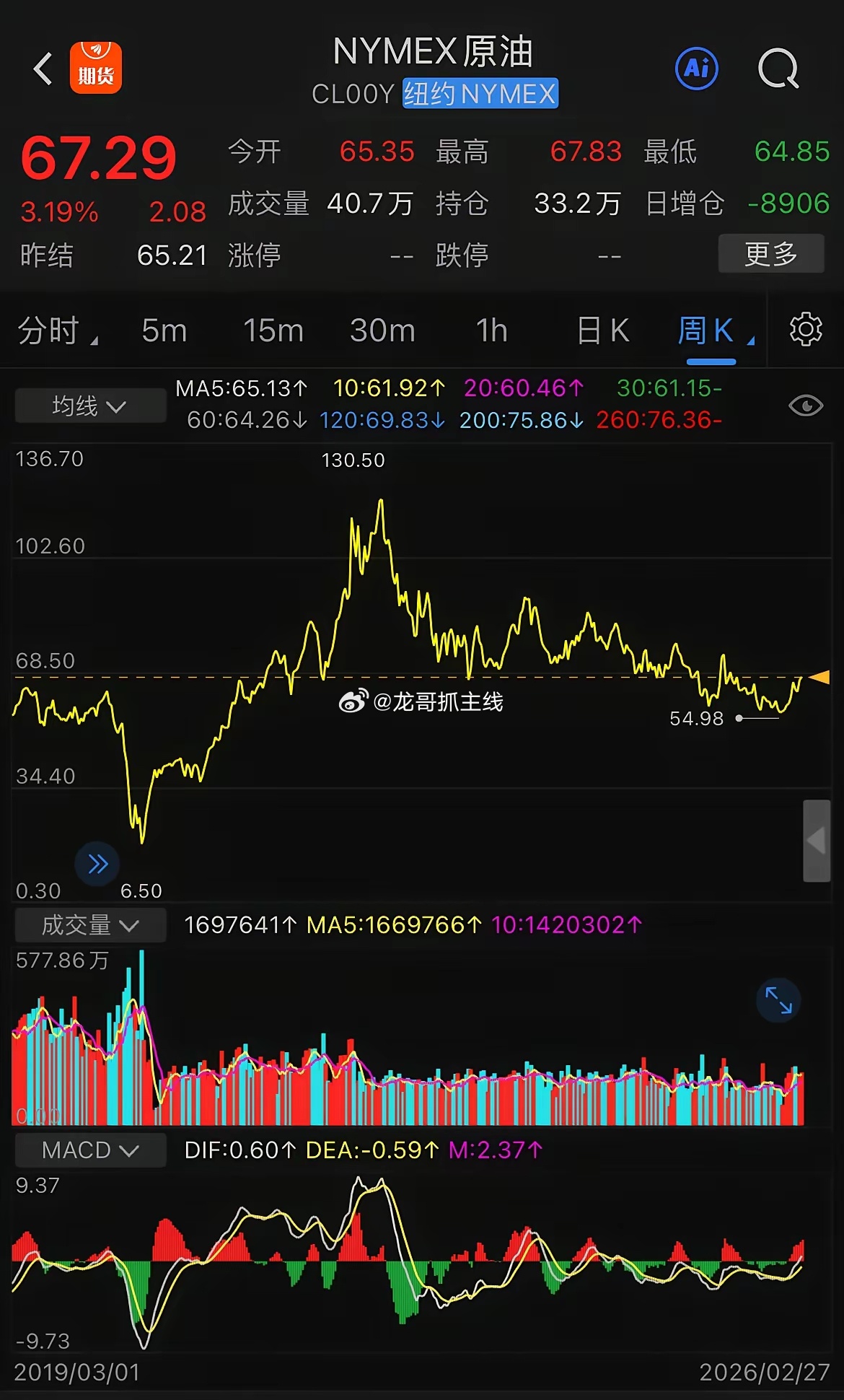 周一油价飞起!多家石油巨头和贸易公司暂停经霍尔木兹海峡的石油和燃料运输。枪炮一响,黄金万两。美以袭击伊朗的第一大负面效应就是油价飞起,下周一必然高开高走。上一次12日战争,美油从60美元涨至74美元,上涨超20%。笔者估计这次至少上涨30%,之前有一些上涨,所以预计价格会涨至78-87美元之间。石油化工相关的品种,燃料油、液化天然气LPG和甲醇都是会跟涨的品种,涨幅还不会小。金发邋遢大王特朗普既然选择了开打,那就要准备接受开打的后果,希望他能承受的住!晒图笔记大赛国际石油走势能源安全问题