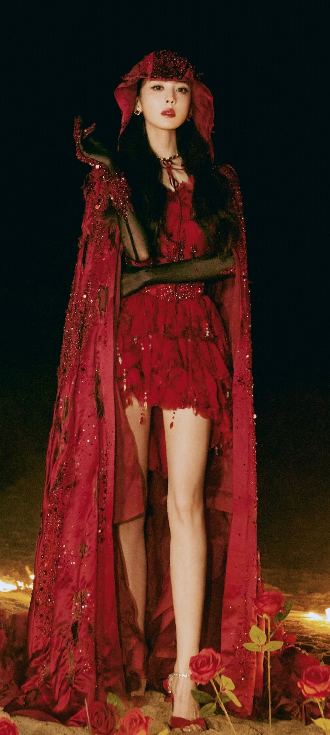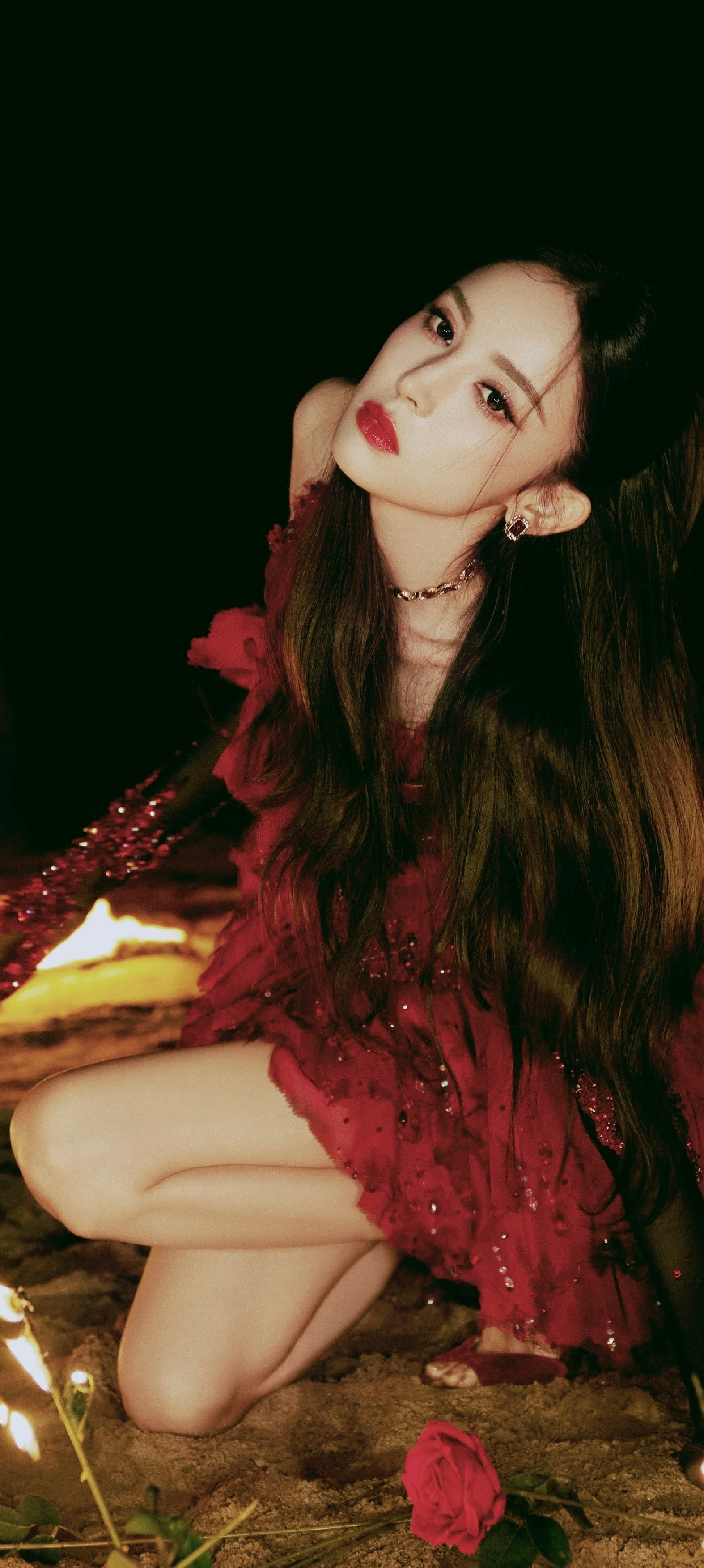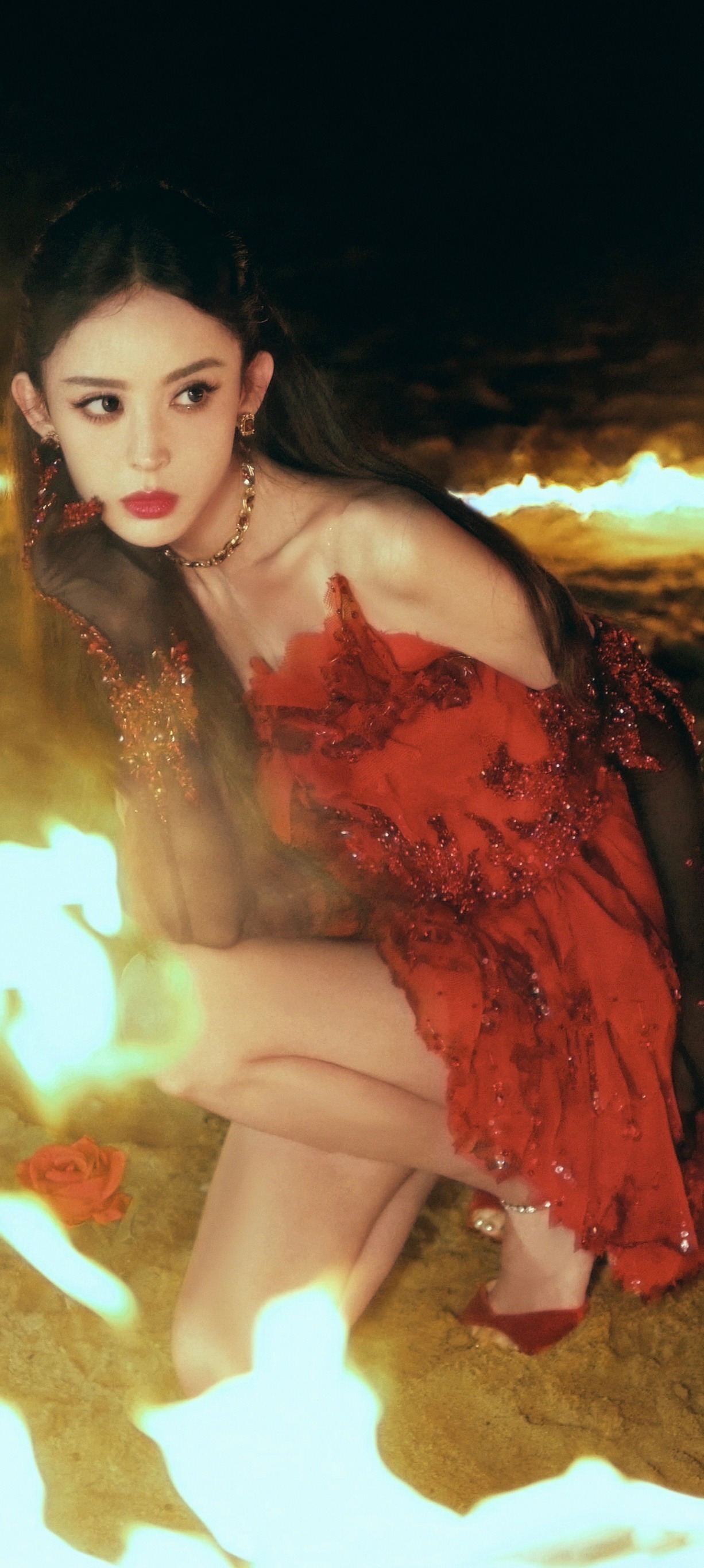 古力娜扎穿搭壁纸:红裙美腿,热烈的异域美人。娜扎