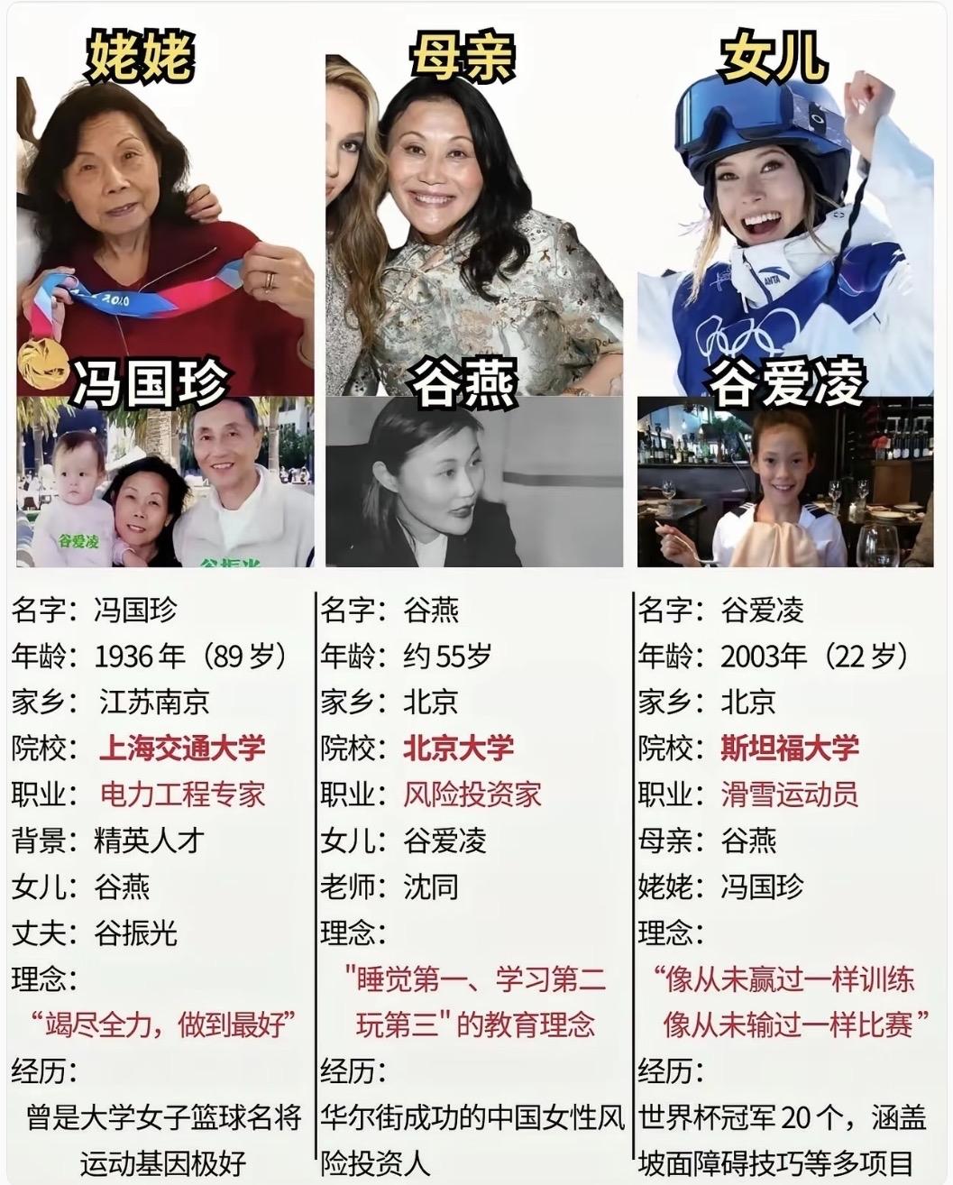 谷爱凌:三代狠人, 托举出一个六边形战士(下篇:破局) 她站在两代女性的肩上, 然后,自己成了光。 谷爱凌:接住托举的那个人 3岁滑雪,9岁夺冠,14岁斩获50金, 15 岁放弃美籍为中国而战, 斯坦福学霸,SAT近乎满分。 20个世界杯冠军, 冬奥夺金,米兰再添银。 她手写《琵琶行》,也说流利京片子。 脑震荡、骨折、失误、质疑, 全都没能让她停下。 但她说: "我的自信,是一次一次摔出来的。" "你可以控制自己的思考方式, 进而你就能掌控自己的人生。" 碎片时间,炼成了铠甲 普通人飞机上睡觉,她在飞机上阅读。 别人周末娱乐,她往返数小时奔赴雪场。 摔倒、爬起、再摔倒、再突破, 直到肌肉形成本能记忆。 不沉溺情绪,不浪费精力, 永远目标清晰,永远步履不停。 所谓开挂, 不过是把天赋配上极致的自律 这个世界从不缺天才, 缺的是能把天赋接住的家庭, 更缺的是接住之后还能跑得更远的人。 谷爱凌不是起点, 而是三代女性跑完接力后, 冲线的那一棒。 你站在第几代,决定了你能托举多远。 你能跑多远,决定了下一代站在哪里。 绝大多数优秀的人, 都是几代人积累、传承、努力加上基因,才最终长成这样的结果。 太过拔尖的基因,后来也可能归于平淡,世界终究会回归平均。 但至少,谷爱凌让我们看见: 女性力量代代相传,可以跑赢时间。