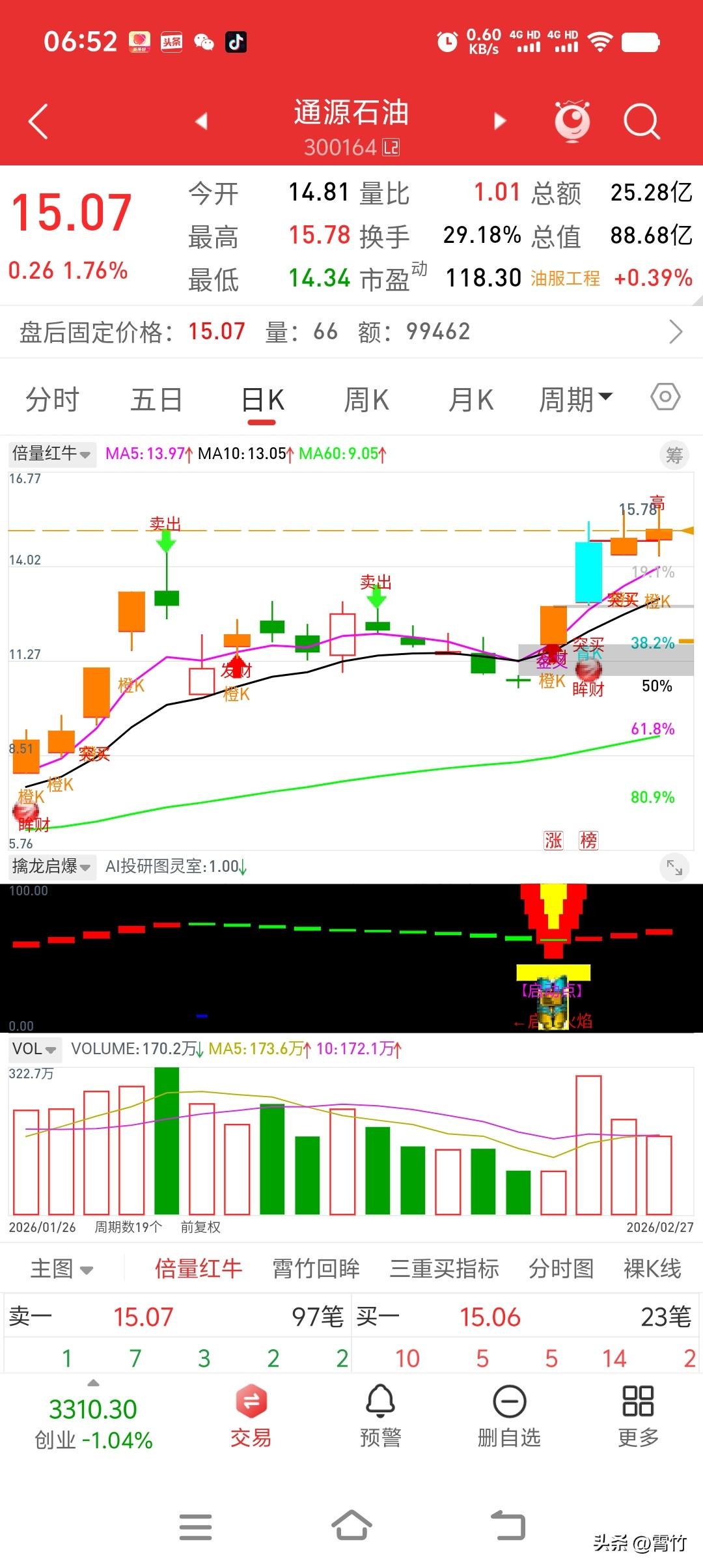 分享我这周有趣的事:伊朗战事起,石油股“涨”声来! --- 伊朗战事风云起,洲际油气通源石油两连板调整缩量后强势再起 中东地缘局势突然升级,成了油气板块最硬的上涨逻辑!随着伊朗方向战云密布,国际油价应声飙涨至半年新高,霍尔木兹海峡的每一丝风吹草动都牵动着市场的神经。在这种背景下,油气开采与油服工程板块形成强势共振,资金关注度显著提升,短线多头动能依然强劲。 看这盘面,真正的强者恒强格局正在上演: 洲际油气(600759) 前期斩获两连板后,经过短暂的缩量调整,今日股价强势再起!技术形态上,“倍量红牛”指标下“突买”信号密集轰炸,而“擒龙启爆”指标更是多次触发【启爆器】信号,股价强势突破前期平台,新一轮行情呼之欲出。 通源石油(300164) 同样不甘示弱,均线系统保持标准的多头排列,量能持续阶梯性放大,显示出资金深度介入的迹象。随着“擒龙启爆”指标同样出现明确的【启爆】信号,在油服工程板块的助攻下,通源石油的进攻号角似乎已经吹响。 在绝对的地缘逻辑面前,技术面的共振往往预示着趋势的加速。经过充分换手的缩量调整,两只龙头的浮筹已清洗殆尽,只要中东局势不出现快速缓和,这种由事件驱动的板块行情大概率仍将向纵深发酵。油气双雄,调整之后,或迎第二波攻势!🚀 股市分析 油气板块 洲际油气 通源石油