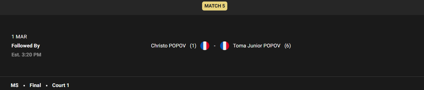男单决赛(22:20):[1]小波波夫(法国)vs[6]大波波夫(法国)