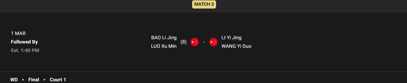 女双决赛(20:40):[8]鲍骊婧/罗徐敏(中国)vs李怡婧/王漪朵(中国)
