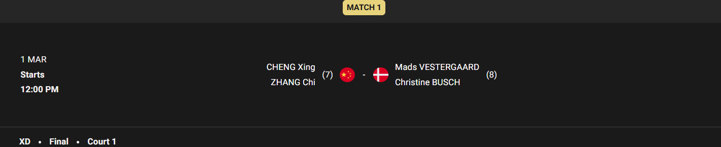 混双决赛(19:00):[7]程星/张驰(中国)vs[8]麦斯/布施(丹麦)