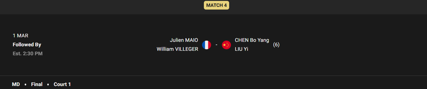 男双决赛(21:30):[6]陈柏阳/刘毅(中国)vs马尤/维利热(法国)