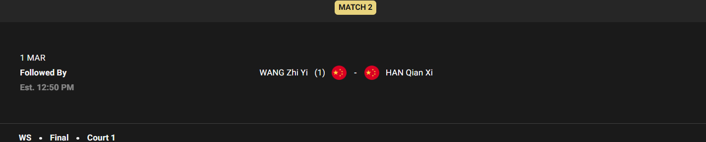 女单决赛(19:50):[1]王祉怡(中国)vs韩千禧(中国)
