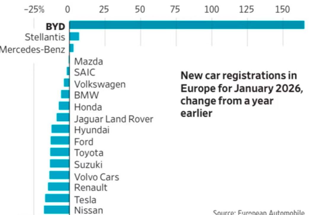 1月,比亚迪在欧洲卖了1.82万辆 1月,上汽名爵(MG)在欧洲卖了约2.6万辆 1月,奇瑞捷途(Jaecoo)在欧洲卖了0.7万辆 1月,奇瑞欧萌达(Omoda)在欧洲卖了0.66万辆