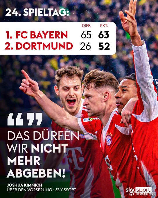 【拜仁3比2多特蒙德,24轮过后拜仁领先大黄蜂多达11分!】贡献绝杀进球的基米希表示:“冠军归属取决于我们自己,我们不能丢掉领先的优势。”德甲
