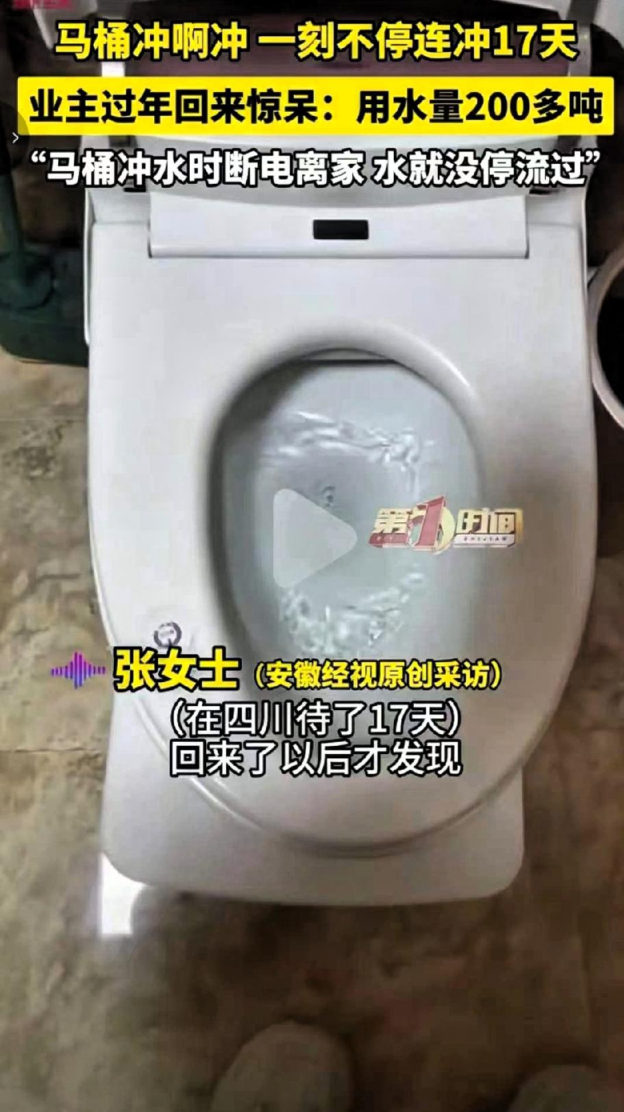 担心的事情还是发生了,河南,一名女子着急出远门,临走前,她抓紧去了趟厕所,因为着急走,她匆忙切断电源。由于部分智能马桶在冲水过程中突然断电,阀门无法自动复位,导致马桶持续流水。 17天后,她接到水务部门的电话,才得知家中用水量异常,最终用水量达200多吨,产生水费800多元。 本是为了省电,结果反而造成了水资源浪费和经济损失,这件事也引发了不少网友的共鸣。有网友表示家人也有过类似操作,产生了高额水费;也有人说普通马桶因按键回弹不畅,同样出现过持续流水的情况。 其实这类问题并非家电故障,而是很多人不了解智能家电的工作特性。智能马桶的冲水系统需要电力控制阀门,中途断电容易导致功能异常。长期离家时,只注重断电,却忽略水路检查,很容易出现隐性漏水。 日常生活中,这类小疏忽并不少见。大家在使用智能家电时,不能只图方便,还要多留意使用注意事项。离家前尽量等马桶完成冲水再断电,条件允许的话,可以关闭卫生间进水阀门,从源头上避免漏水隐患。 智能产品给生活带来便利的同时,也需要我们正确使用和维护。多了解一点使用常识,多花一点时间检查,就能有效避免不必要的浪费,既节约水资源,也能减少经济损失。